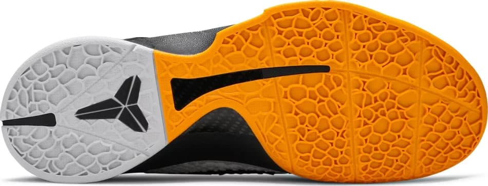Kobe 6 Protro Playoff Pack White Del Sol - это совместная работа Nike и покойного чемпиона НБА для коллекции POP. Кроссовки выполнены в белом, нейтральном сером, желтом и черном цветах. Полиуретановые "островки" создают текстуру на бело-сером верхе. Кроссовки укреплены черной формованной пяткой и украшены черным свушем. Мидсоль имеет большой и гибкий блок Air Zoom Turbo в носочной части и пеноматериал в пяточной части. Текстура аутсоли напоминает змеиную кожу, на пятке воспроизведена подпись Коби.- Цвета: White/Neutral Grey/Del Sol/Black