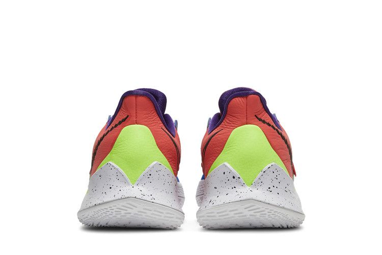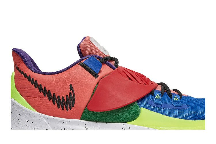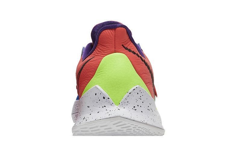 Kyrie Low 3 "NY vs. NY" - это версия фирменных низких кроссовок Кайри Ирвинга, выполненная в цветовом блоке и вдохновленная главным стритбольным турниром Нью-Йорка. Носочная часть из сетки королевского синего цвета сочетается с коралловой кожей на пятке, оба сегмента соединены регулируемым ремешком в средней части стопы. Личный логотип Кайри украшает тканый язычок на левом ботинке, а на правом - логотип NY vs NY. Промежуточная подошва из пенополиуретана с крапинками оснащена амортизатором Zoom Air в носочной части, обеспечивающим эффективную амортизацию.