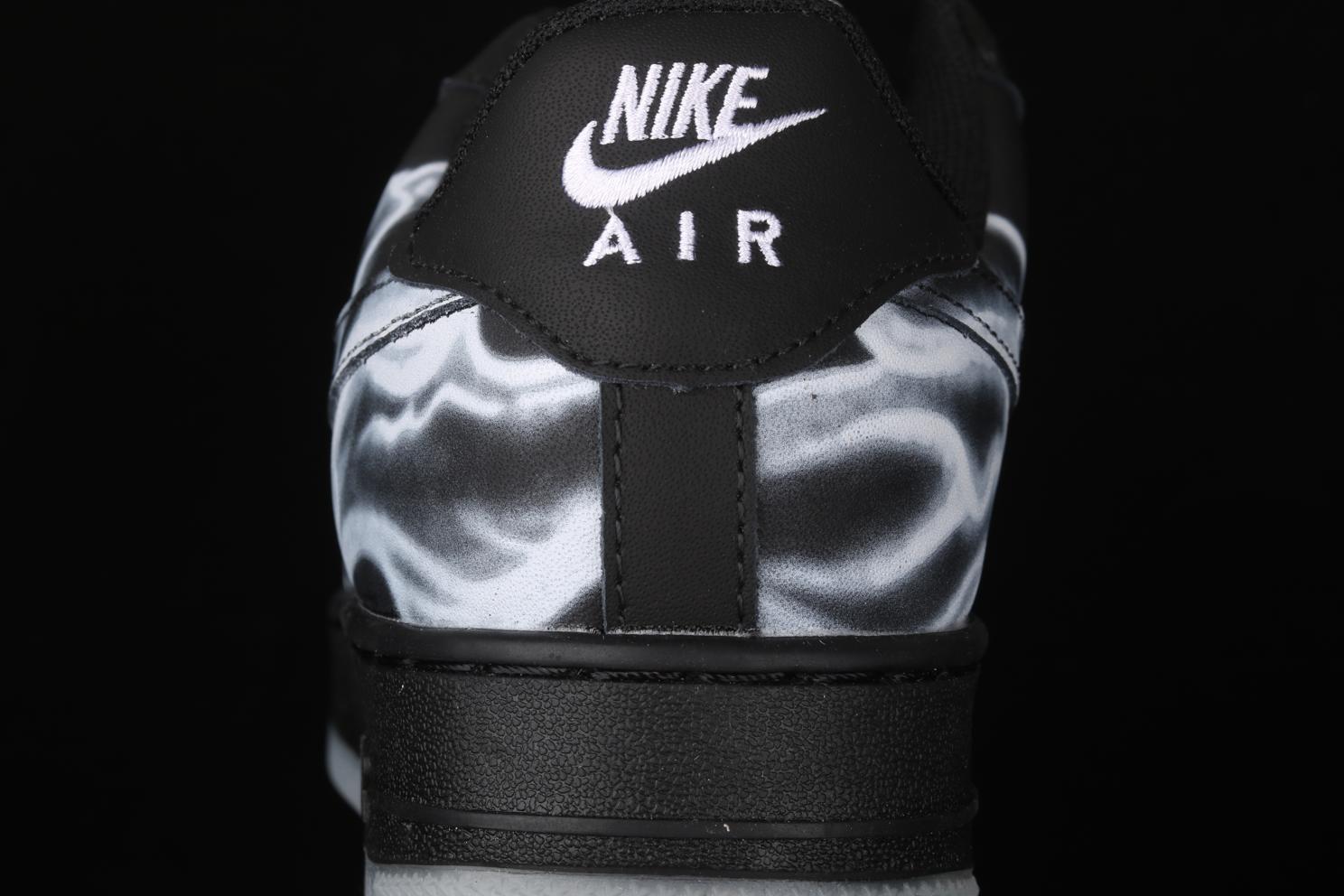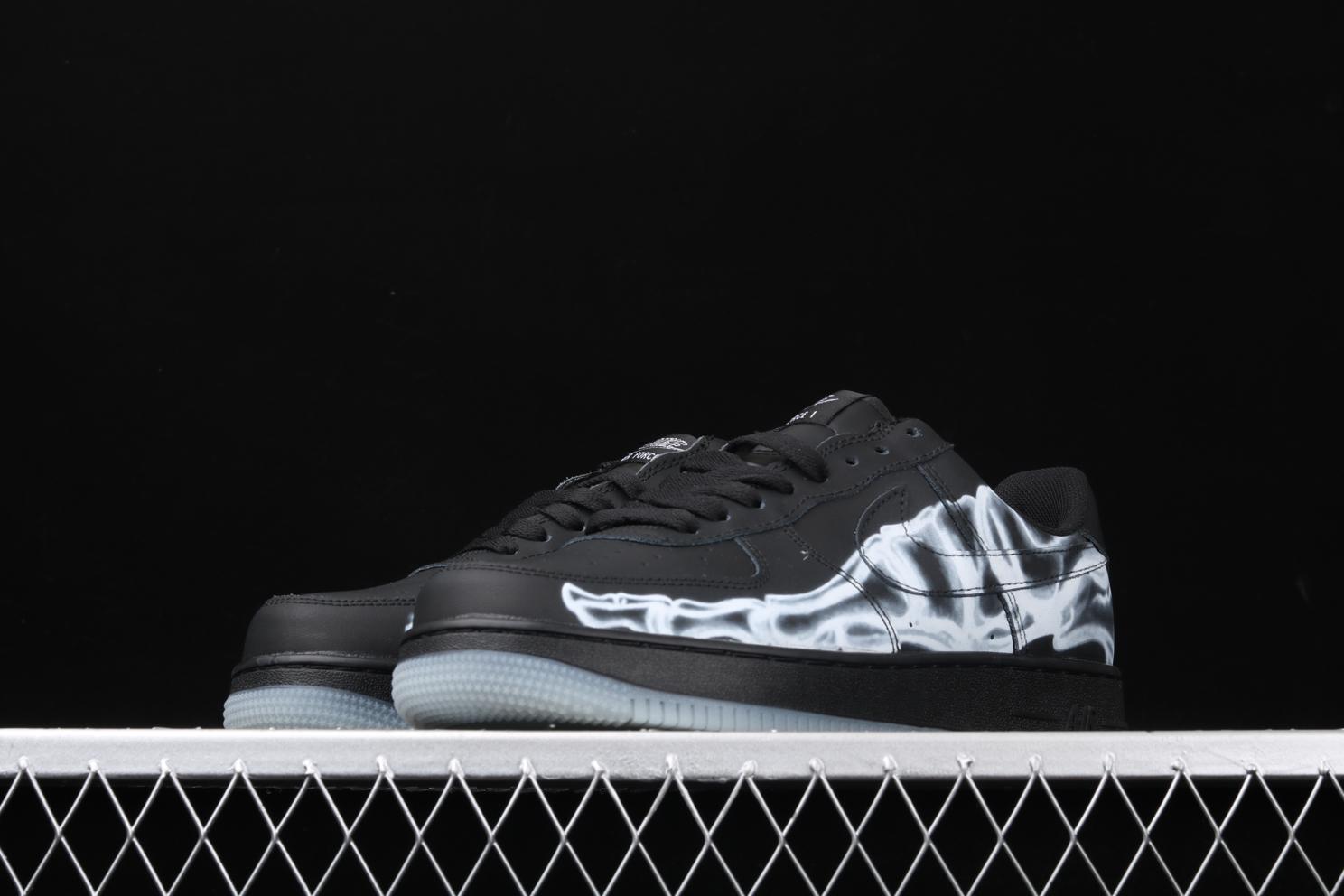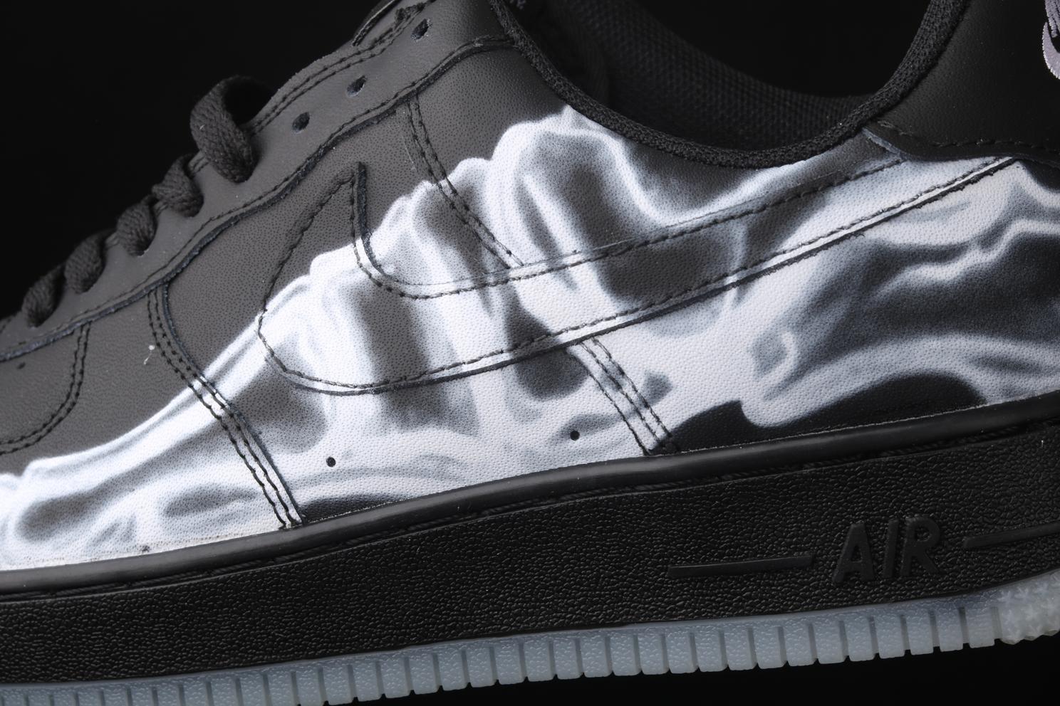 Выполненная в черной коже с анатомической аэрографией с особым эффектом, светящимся в темноте, модель Nike Air Force 1 07 QS Black Skeleton была выпущена 26 октября 2019 года к празднованию Хэллоуина. Кроссовки сохраняют свой сдержанный внешний вид и комфорт, имеют поддерживающие накладки, мягкую амортизацию и полупрозрачное прочное резиновое сцепление.- Цвета: Black/Black/Black