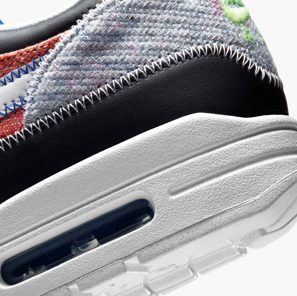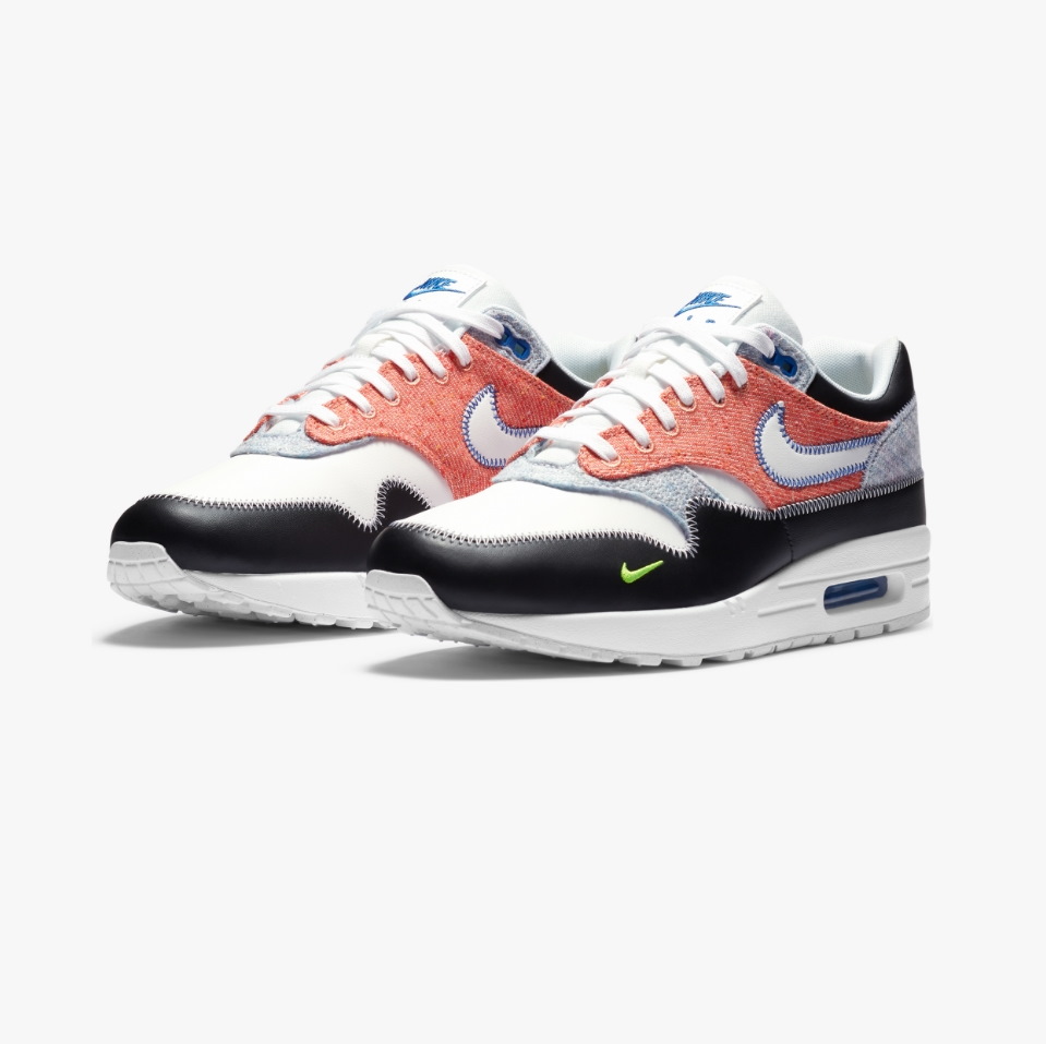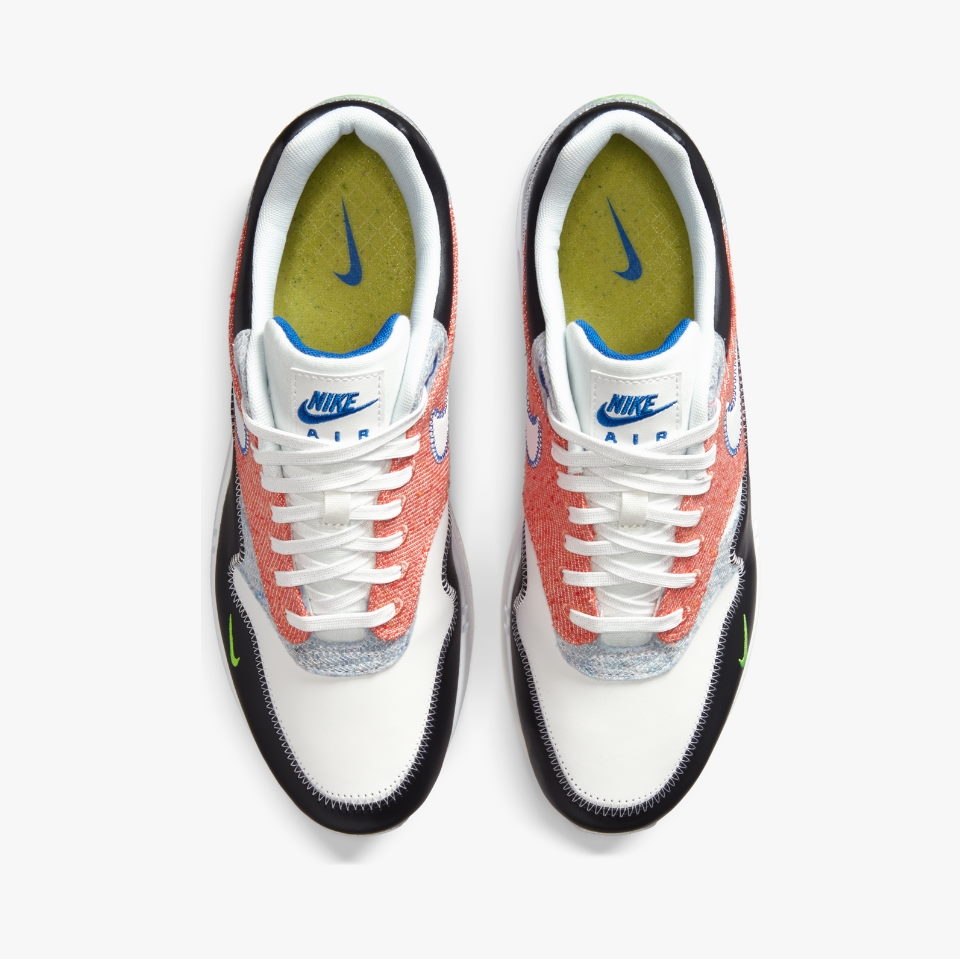 Nike Air Max 1 Recycled White имеют разноцветный верх с черно-белой основой. Кроссовки изготовлены из переработанных материалов, используя технику сшивания из различных холстов. Черные кожаные брызговики, логотип Neon Green на передней части стопы и белая подошва завершают дизайн.- Цвет: Белый, Черный, Электрический зеленый, Игровой королевский