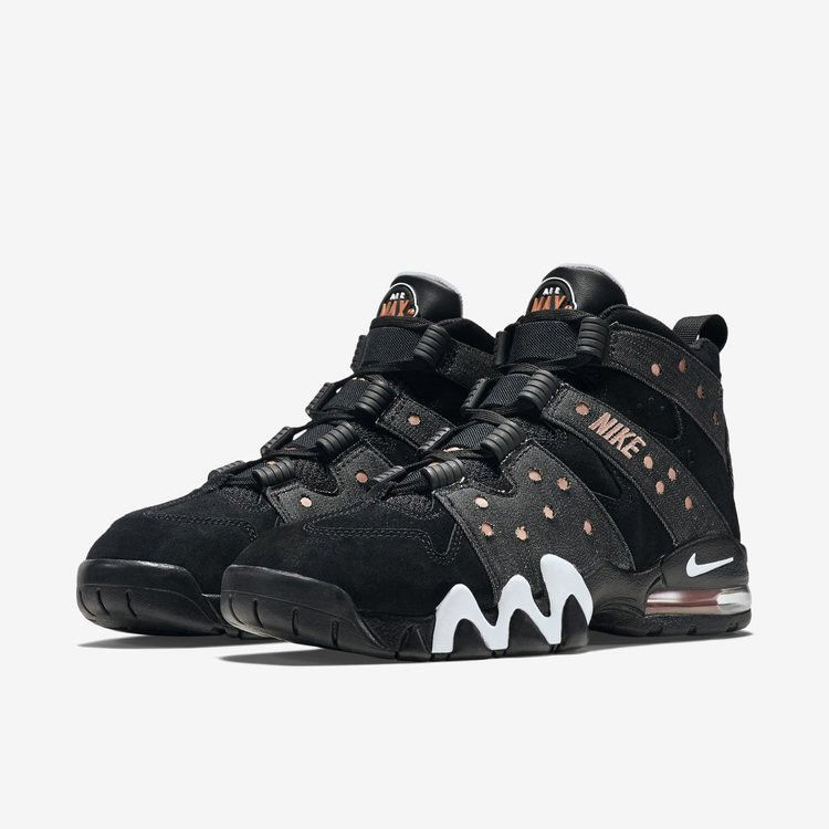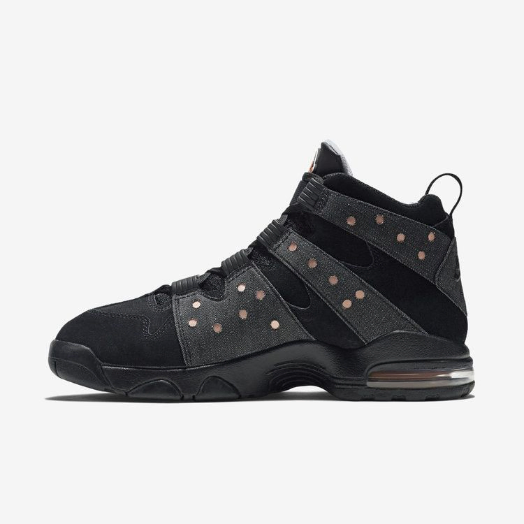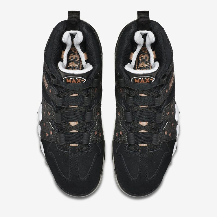 Фирменные Air Max 2 CB 94 Чарльза Баркли были созданы в соответствии с его физическим стилем игры. Верхняя часть кроссовок выполнена из замши и кожи, а система шнуровки, вдохновленная прямой курткой, призвана повысить устойчивость. Модель Black Denim выполнена из текстиля с узором в горошек Metallic Red Bronze по всей поверхности накладок, идущих от люверсов к подошве для лучшей поддержки стопы, а амортизирующий блок Max Air в пятке обеспечивает амортизацию.