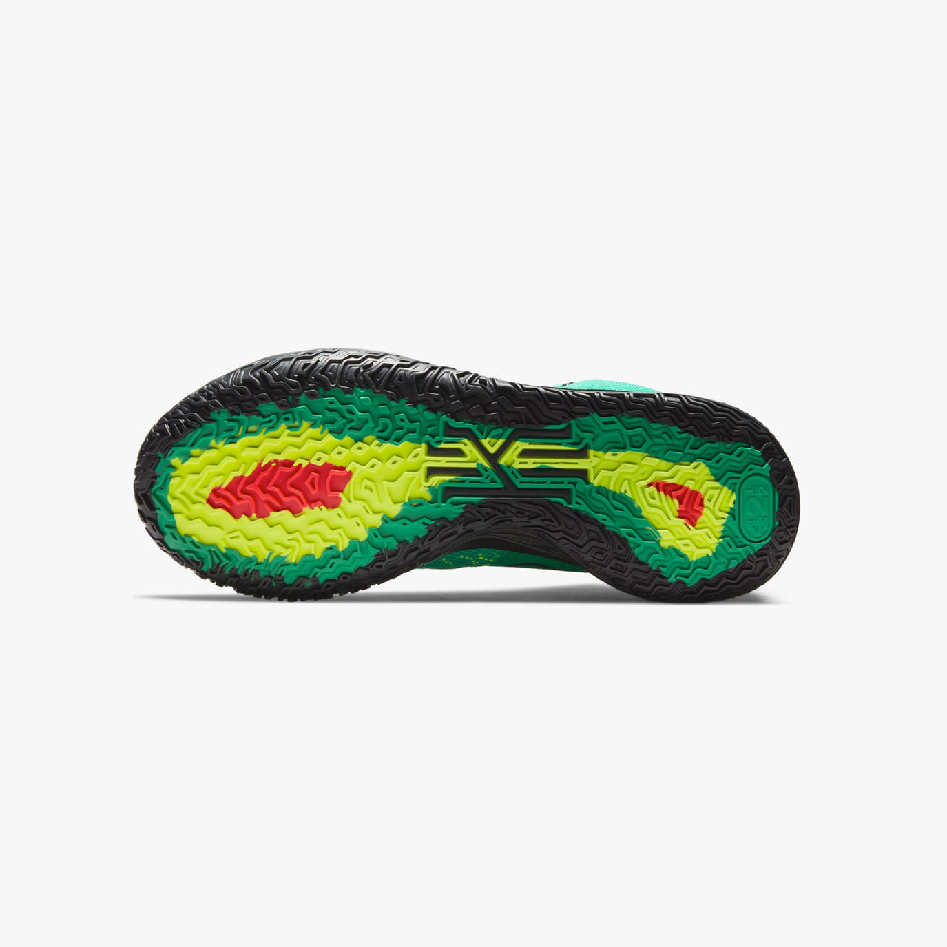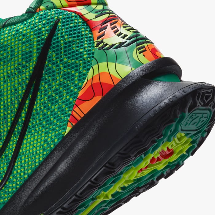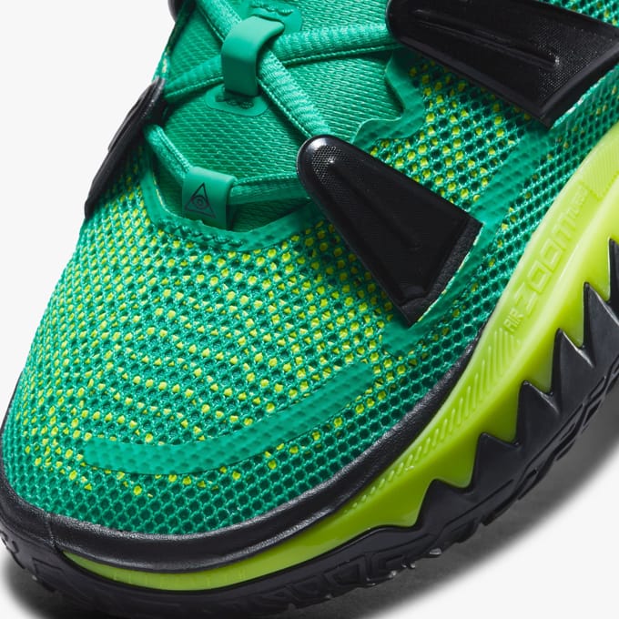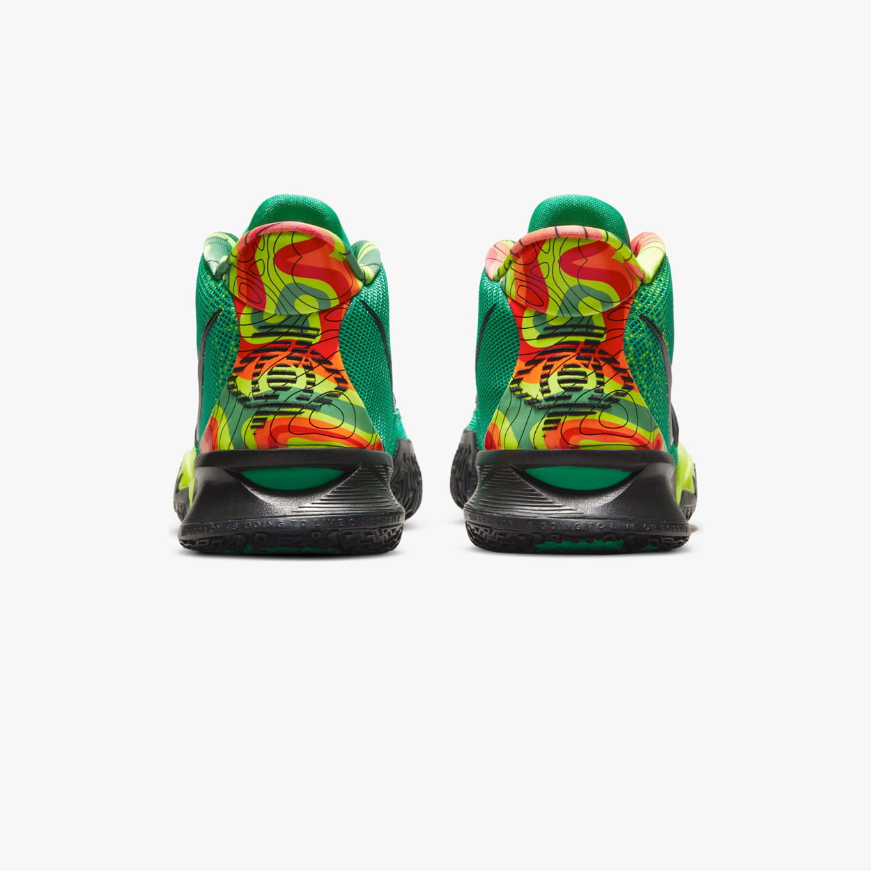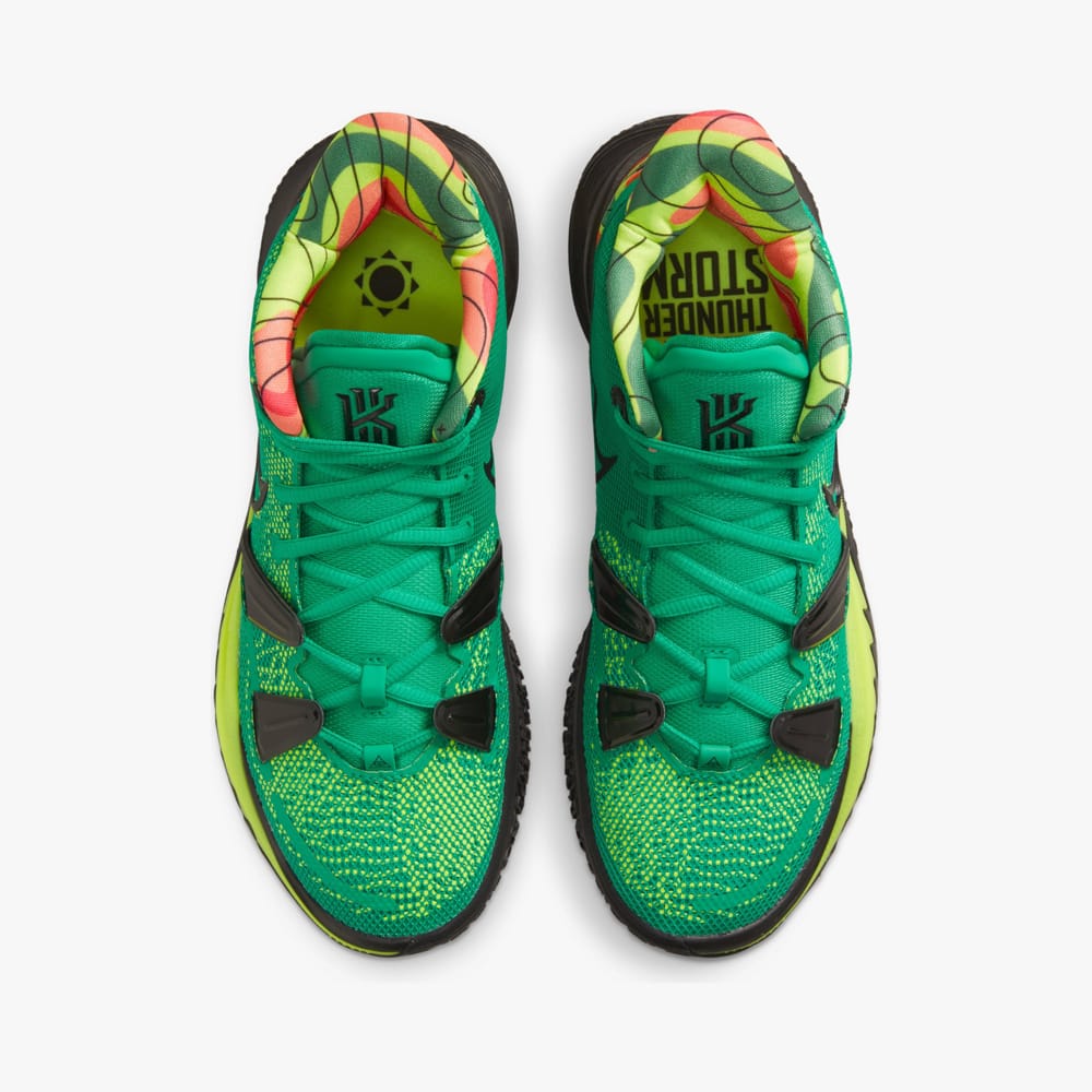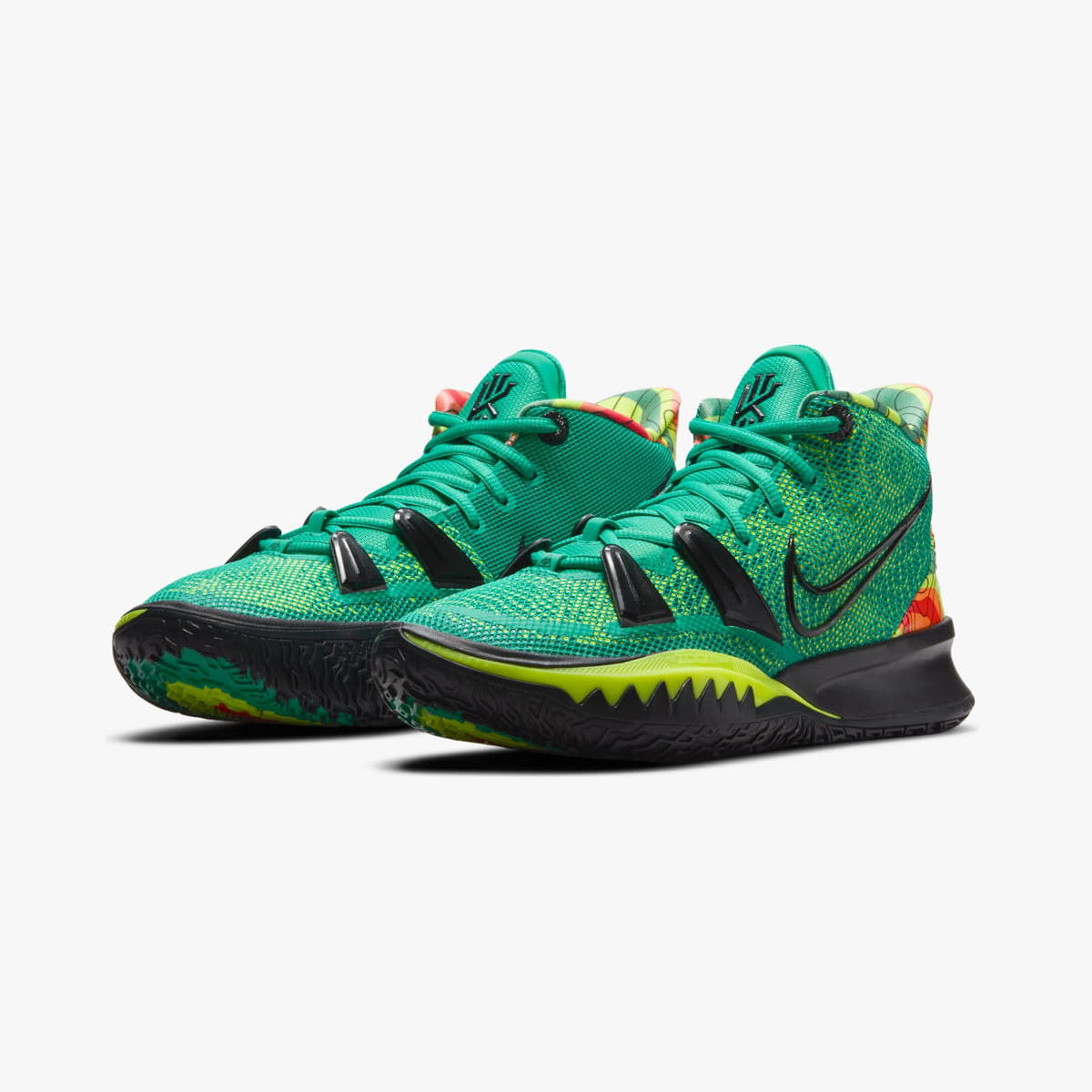 Модель Nike Kyrie 7 'Ky-D Weatherman' демонстрирует знакомый дизайн, смоделированный по любимой фанатами расцветке из фирменной линии Кевина Дюранта, в частности, версии KD 4 'Weatherman', вдохновленной детской мечтой Дюранта стать теле-метеорологом. Как и его предшественник, обувь имеет ярко-зеленую отделку по всему верху, а также разноцветную тепловую карту на пятке, внутренней подкладке и резиновой подошве. На стельке левого ботинка напечатано изображение с надписью «Прогноз требует грозы».- Цвета: Stadium Green/Volt/Total Orange/Black