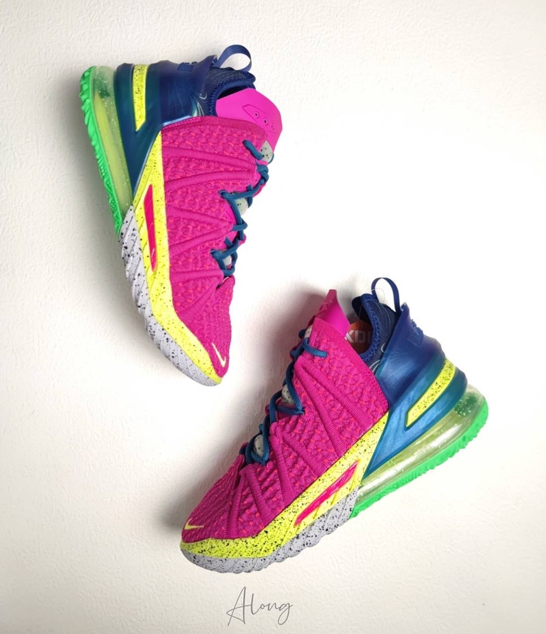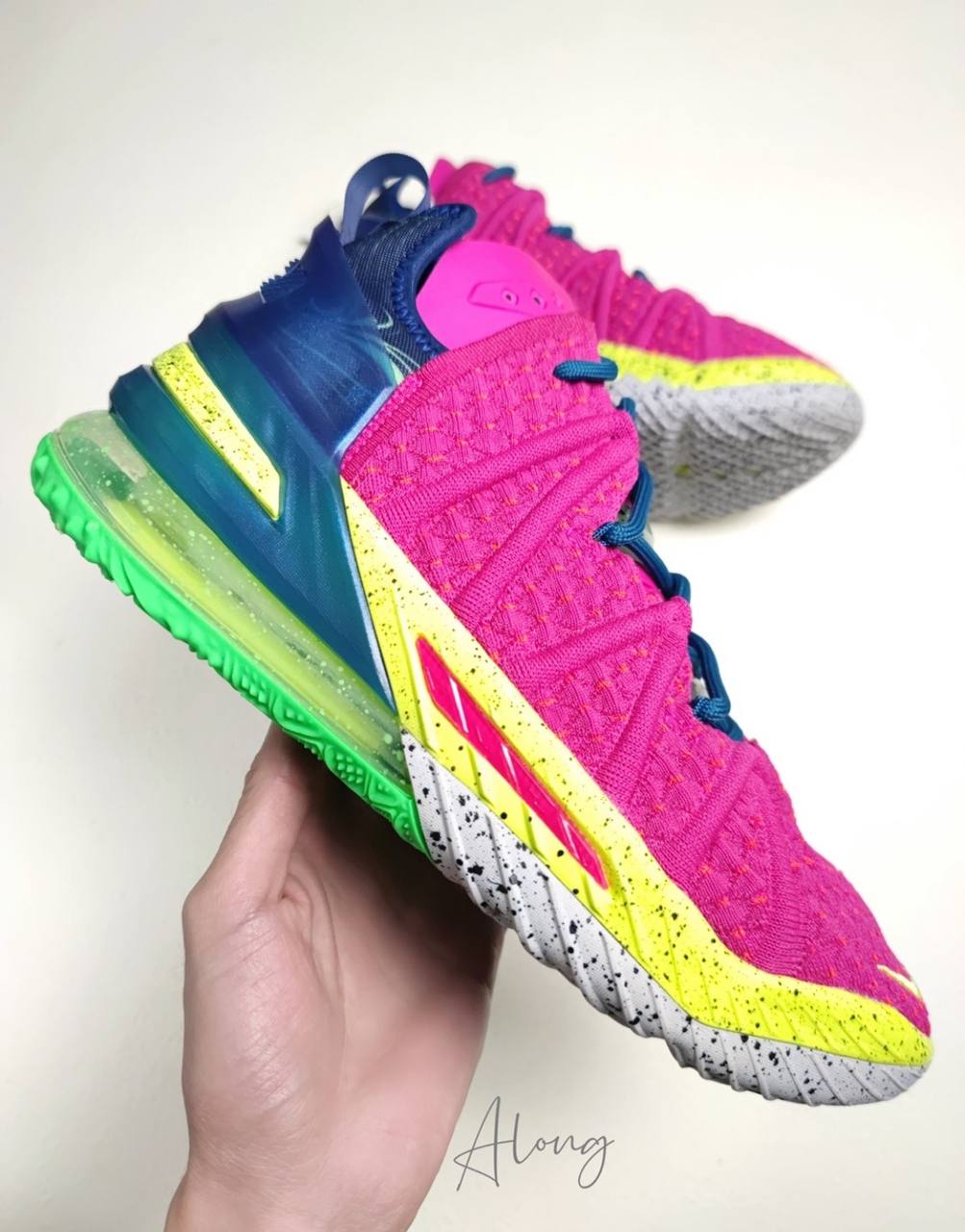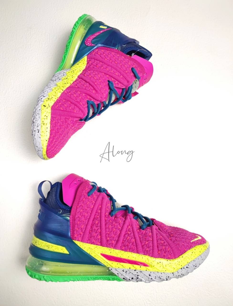 Nike LeBron 18 «Los Angeles By Night» является продолжением силуэта «Los Angeles By Day» с уникальным дизайном, вдохновленным новым родным городом Леброна Джеймса. В этой паре используется верх KnitPosite 2.0 яркого оттенка фуксии, контрастирующий с металлической синей отделкой на внешнем заднике из термополиуретана. Пятнистые детали разбросаны по всей подошве из пеноматериала и видимому блоку Max Air, который удерживает блок Zoom Air во всю длину.- Цвета: Pink Prime/Multi-Color
