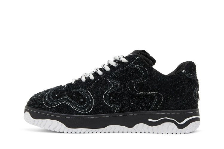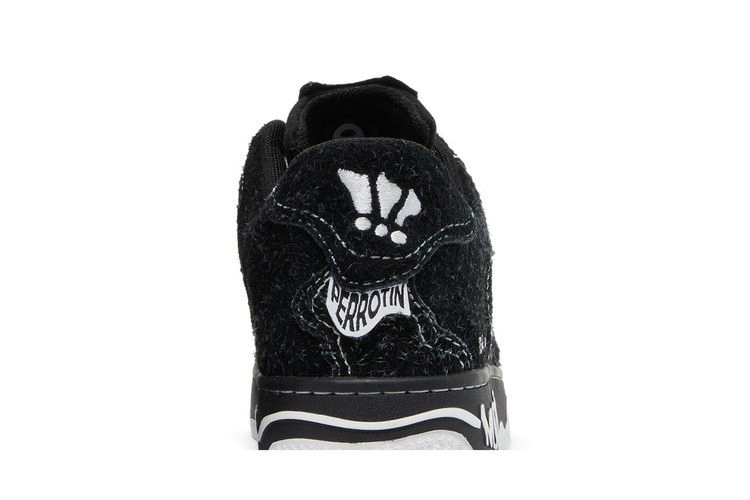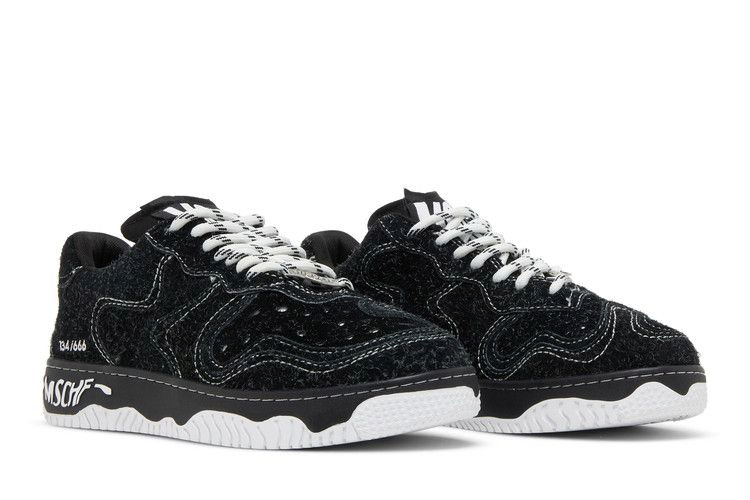 Модель Perrotin x MSCHF Super Normal 2 "5 O'Clock Shadow", разработанная совместно с нью-йоркской галереей современного искусства, представляет собой продолжение оригинальной модели Super Normal, выпущенной бруклинской творческой студией в июне 2022 года. Силуэт, вдохновленный ретро, выпущен ограниченным тиражом в 666 пар и имеет ворсистый верх из черной замши с волнистой контрастной белой строчкой. Фирменные элементы включают в себя деформированные логотипы MSCHF на язычке и посеребренные дубли шнурков, фирменные восклицательные знаки MSCHF на язычке пятки, а также искаженный ярлык Perrotin на пятке. На боковой пятке вышит номерной экземпляр обуви. Лоу-топ опирается на "разжиженную" подошву, подчеркнутую черными боковинами и белой резиновой подошвой.
