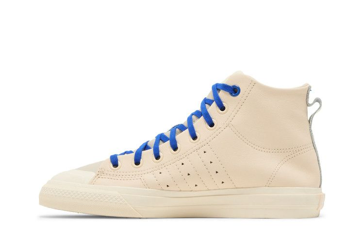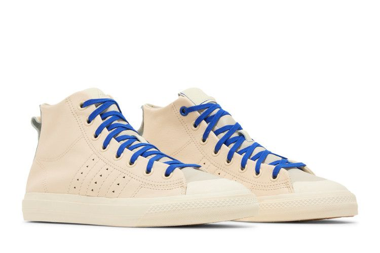 Модель Pharrell Williams x Nizza Hi 'Cream', созданная в сотрудничестве с мультигиперфеновым креативщиком, придает ретро-силуэту adidas минималистичный вид. Кожаный верх кроссовок выполнен в однотонном цвете Ecru Tint и украшен королевскими синими шнурками для контрастного выделения цвета. Треугольный логотип Pharrell 'Hu' выбит на кожаном язычке и дополнен трехполосными деталями с треугольной перфорацией.