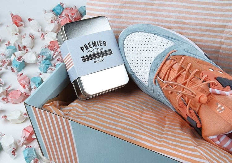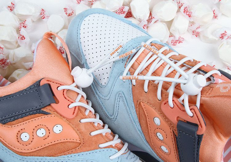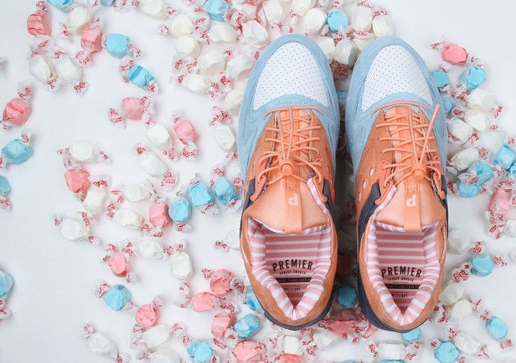 Уличная версия Saucony Grid 9000 "Street Sweets Delicious" - дело рук мичиганского магазина скейтов и одежды Premier. Кроссовки одеты в тафтовый цвет и оснащены эластичными шнурками с регулируемыми застежками, накладками из кожи и замши и принтом в виде леденцов на стельке. Неопреновый язычок, украшенный полоской в виде конфеты "P", является частью внутренней конструкции ботинка. Верх в пастельных тонах поддерживается толстой промежуточной подошвой из ЭВА.