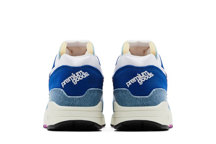 Модель Premium Goods x Nike Air Max 1 SP 'Houston' посвящена Хьюстону, штат Техас, и выпущена тиражом 713 пар в честь кода города. Модель выполнена из белой сетки, контрастирующей с кожаной накладкой на ноге цвета морской волны, текстильной накладкой на передней части ноги цвета фуксии и брызговиком из синей джинсовой ткани. Помимо малинового кожаного логотипа Swoosh, элементы брендинга включают белый мини-Swoosh, вышитый на боковой части передней части стопы, и надпись 'Premium Goods' на синей текстильной панели пятки. На тканом язычке нанесены надписи '.02' и '.04', указывающие на годы основания бруклинского и хьюстонского филиалов Premium Goods.