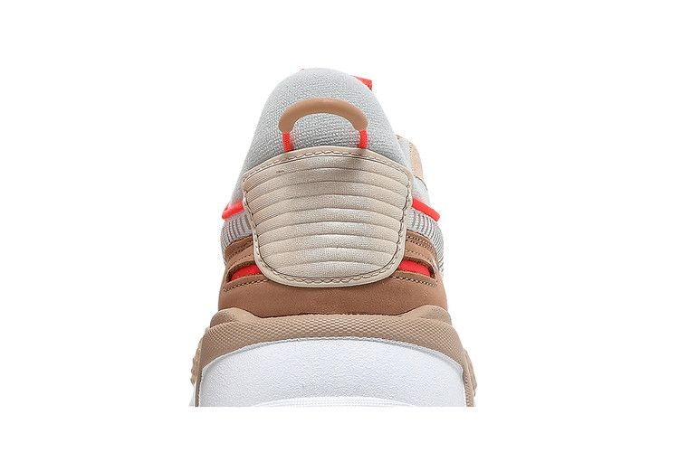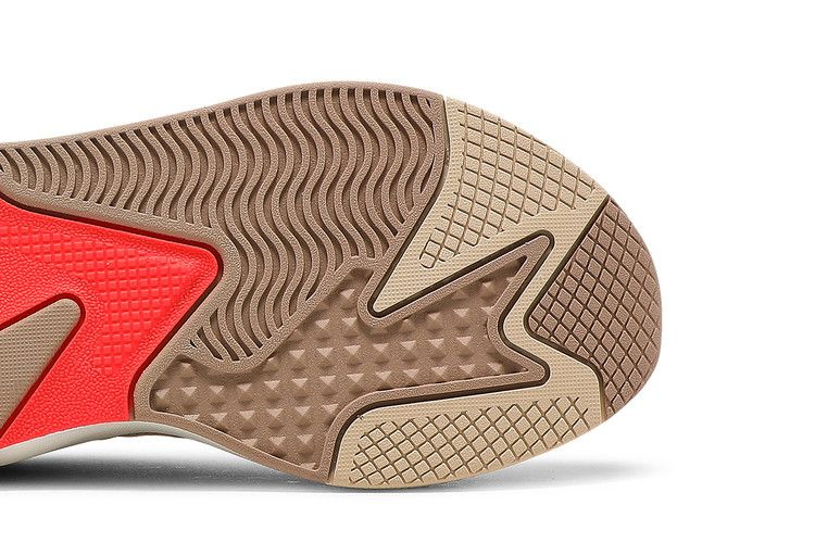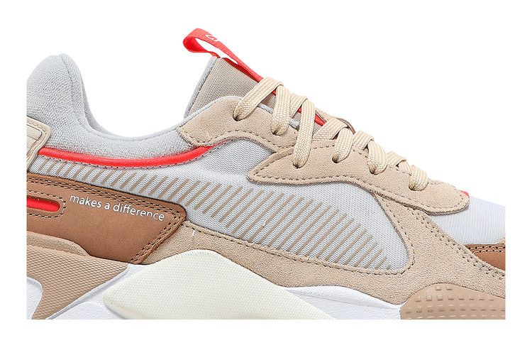 Модель PUMA RS-X 'Convey' выполнена в теплой палитре, сочетающей натуральные оттенки с яркими оранжевыми акцентами. Дышащий текстиль усилен накладками из замши цвета загара и нубука светло-коричневого цвета, на последней из которых имеется надпись "Every difference makes a difference". Чувствительная амортизация обеспечивается полиуретановой промежуточной подошвой с геометрическими элементами из TPU, встроенными в боковую часть. Подошва из твердой резины обеспечивает надежное сцепление с поверхностью.
