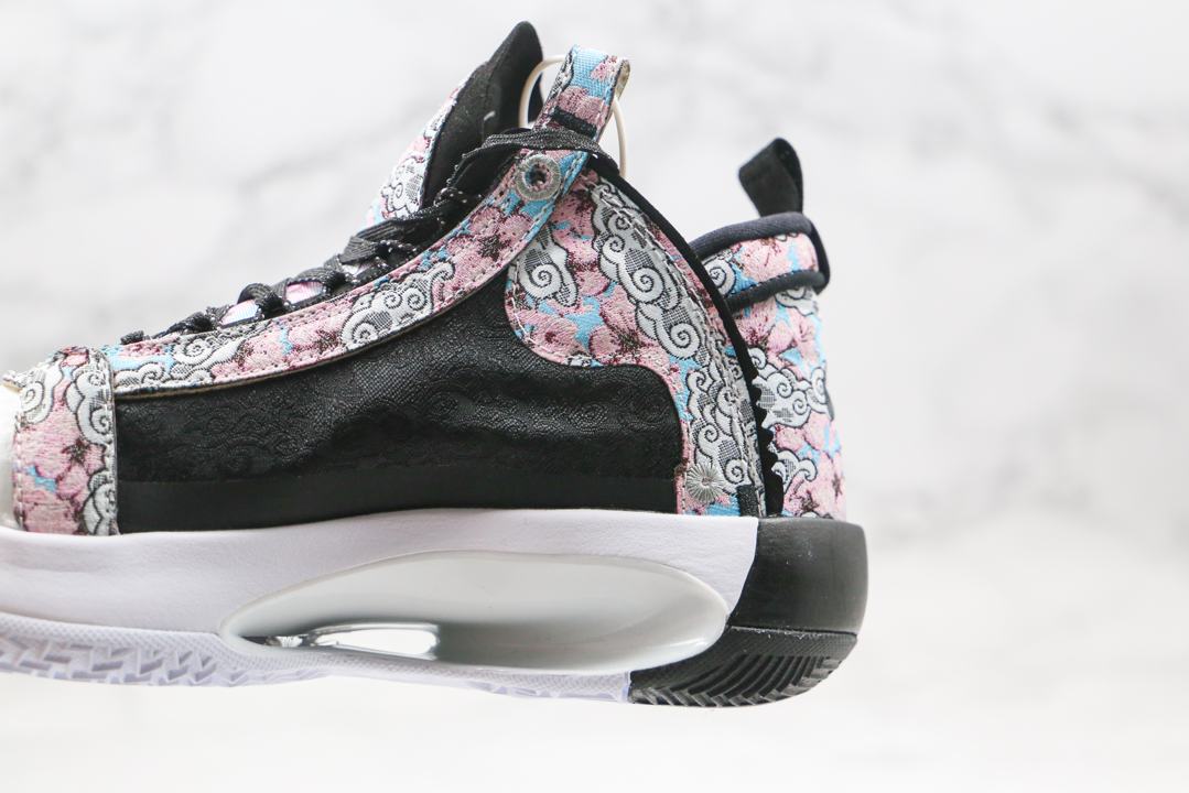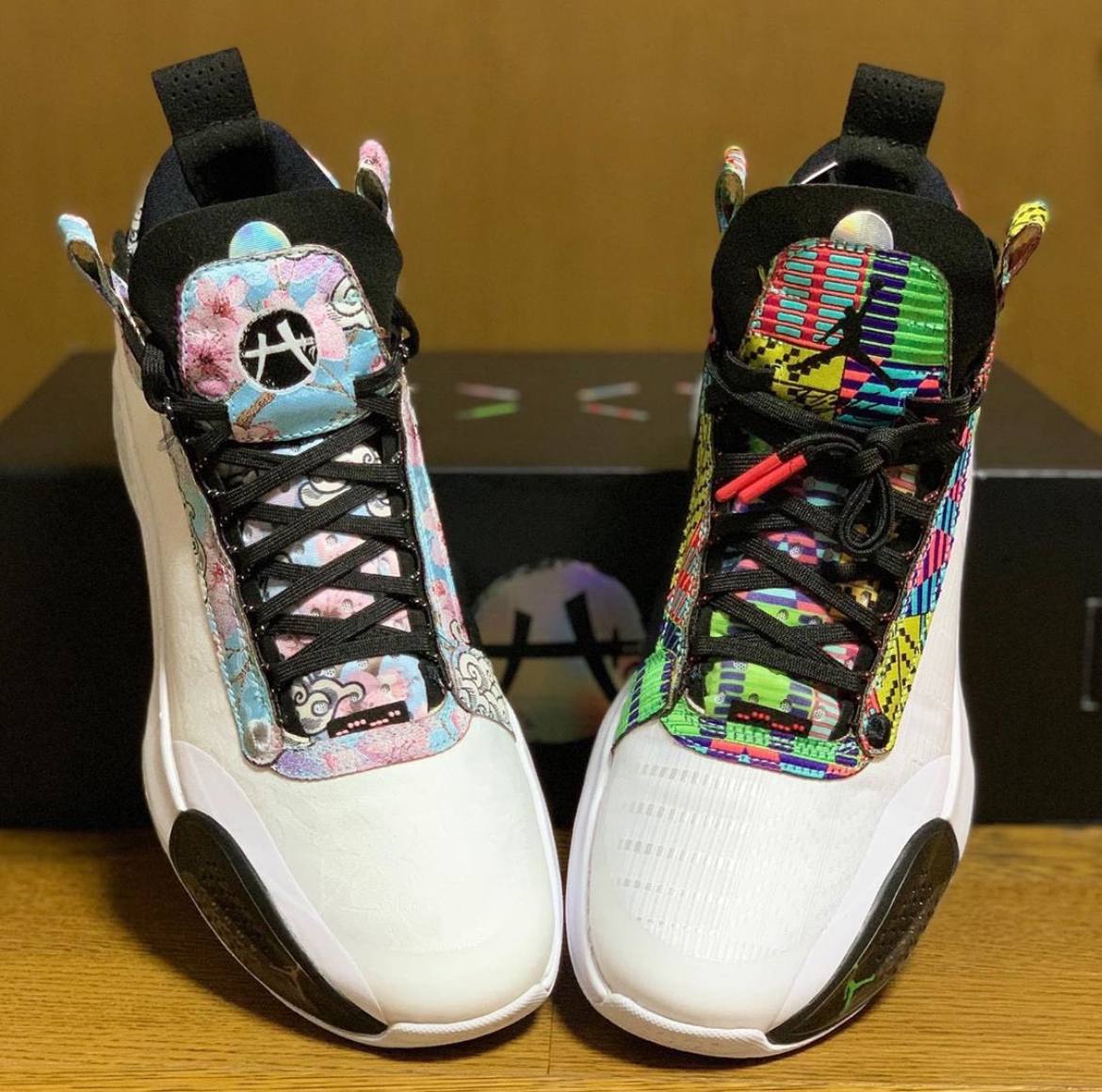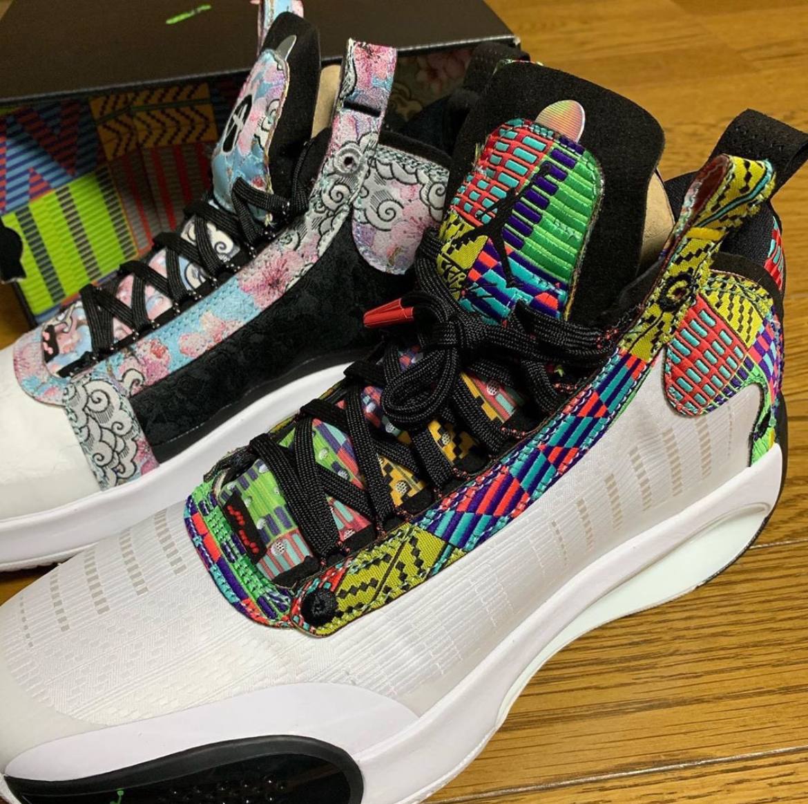 Модель Rui Hachimura x Air Jordan 34 Heritage выпущена 9 августа 2020 года в яркой необычной цветовой гамме, а также имеет инновационные технологии и сохраняет функциональность. Эти кроссовки созданы дизайнером Тейтом Куэрбисом в сотрудничестве с Rui Hachimura и также ориентированы на легкость. Белый верх имеет цветочный принт в пяточной части и на системе шнуровки. Черно-белая мидсоль также подчеркивает этот яркий дизайн.- Цвета: Multi-Color/Multi-Color