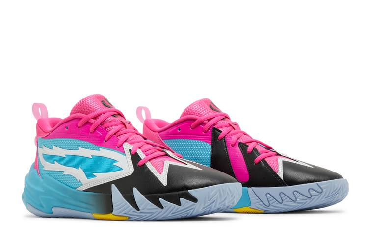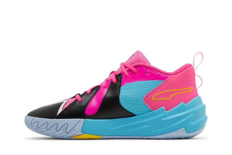 PUMA Scoot Zeros "Northern Lights" - дебютная фирменная обувь Скута Хендерсона, выполненная из сетки оттенков фуксии и аква-синего, в сочетании с угловатой накладкой на носочной части из черной кожи. Розовая искусственная замша обволакивает пятку и украшена вышитой полосой PUMA Formstrip на медиальной стороне. Легкая амортизация обеспечивается промежуточной подошвой PROFOAM EVA, которая поддерживается нескользящей подошвой из износостойкой резины.