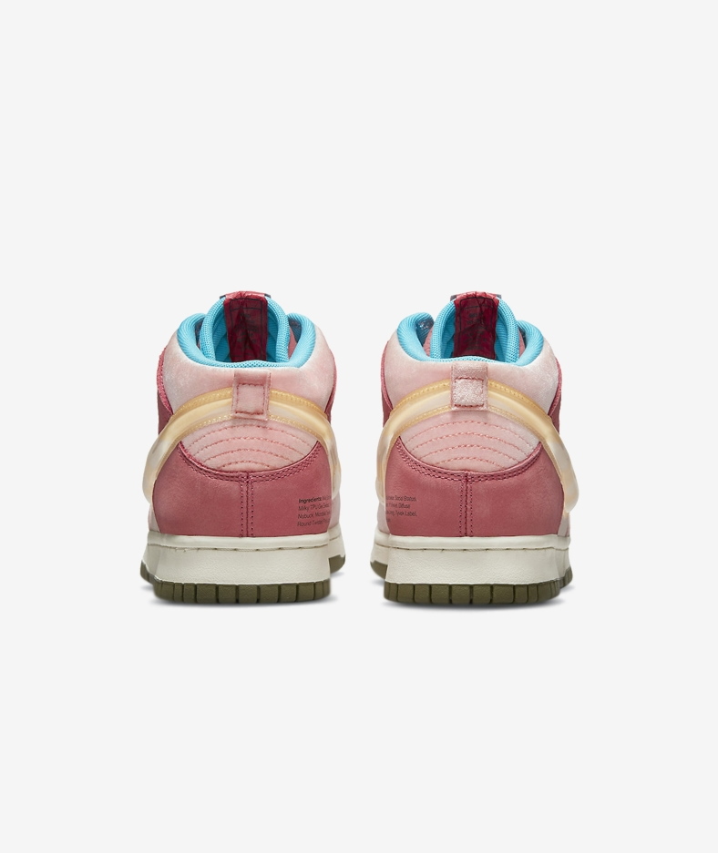 Кроссовки Social Status x Nike Dunk Mid «Strawberry Milk» в цветовой гаммой «Шоколадное молоко», завершают набор «Бесплатный обед» в магазине кроссовок, вдохновленный программами бесплатного питания в государственных школах, финансируемыми из федерального бюджета. Розовые шнурки закрепляют средний верх с коричневой основой из нубука с накладками на переднюю часть стопы и пятку из розового бархата и кожи кораллового цвета соответственно. Уникальные бренды включают перламутровый логотип TPU, список «ингредиентов» на медиальной пятке и красные язычки Tyvek, на которых отображаются несоответствующие логотипы Nike и Social Status. Оснащение кроссовок состоит из не совсем белой мидсоли и оливковой резиновой подошвы.- Цвет: Light Soft Pink/Coconut Milk/Pink Glaze