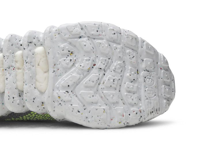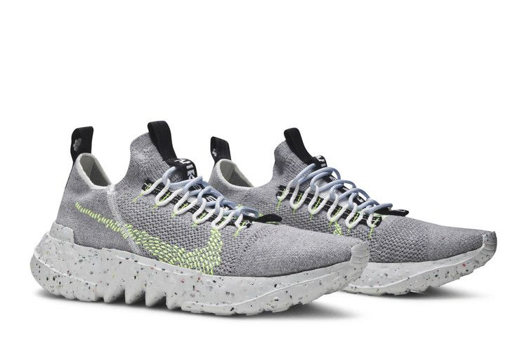 Модель Nike Space Hippie 01 "Grey Volt" создана на основе исследовательской коллекции обуви, в которой использован "космический мусор" - различные отходы, собранные на фабриках Nike. Верх из трикотажа, созданный из переработанных пластиковых бутылок с водой, футболок и обрезков пряжи, лежит на промежуточной подошве Crater Foam, сочетающей стандартную пену и 15% резины Nike Grind. Пенопластовая стелька ZoomX сделана из обрезков, оставшихся после производства Vaporfly 4%.