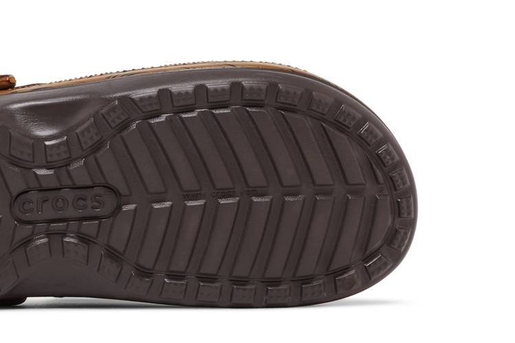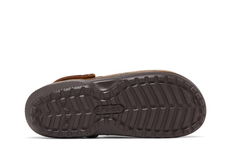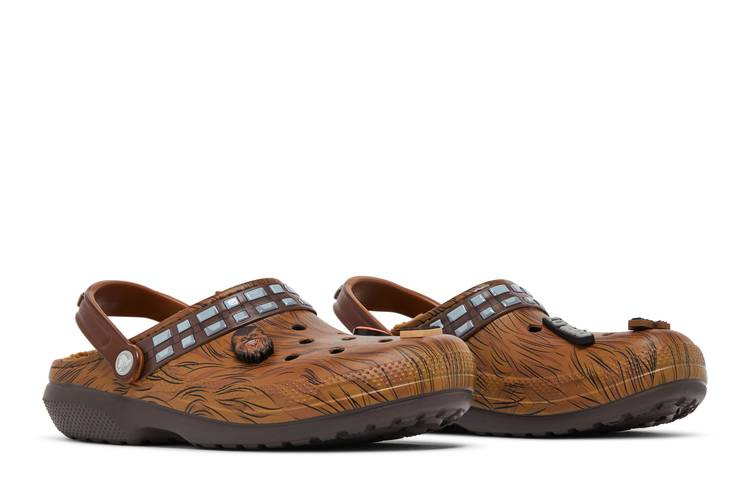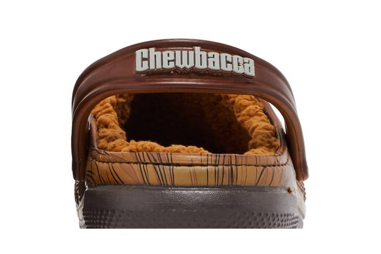 Star Wars x Crocs Classic Lined Clog 'Chewbacca' отдает дань уважения товарищу Хана Соло по кораблю вуки. Верх из вспененного материала Croslite покрыт коричневым мехом с графическим рисунком и подкладкой из мохнатого текстиля. Поворотный ремешок на пятке украшен тисненым знаком "Chewbacca", а накладка в средней части стопы имитирует фирменную бандольеру персонажа. В комплект входят специальные брелоки Jibbitz с изображением Миллениумского сокола, значка Альянса повстанцев и сходства с Чуи.