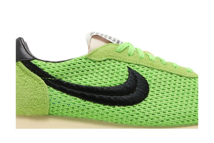 Кроссовки Stussy x Nike LD 1000 SP "Action Green" выполнены из сетки цвета лайма, украшены тональными замшевыми накладками и черным вышитым логотипом Swoosh. На язычке из вспененного материала красуется совместная тканая бирка, а на заднике из черной кожи - надпись Stussy. Легкая амортизация обеспечивается межподошвой из белой пены, а подошва из черной резины с вафельным рисунком.