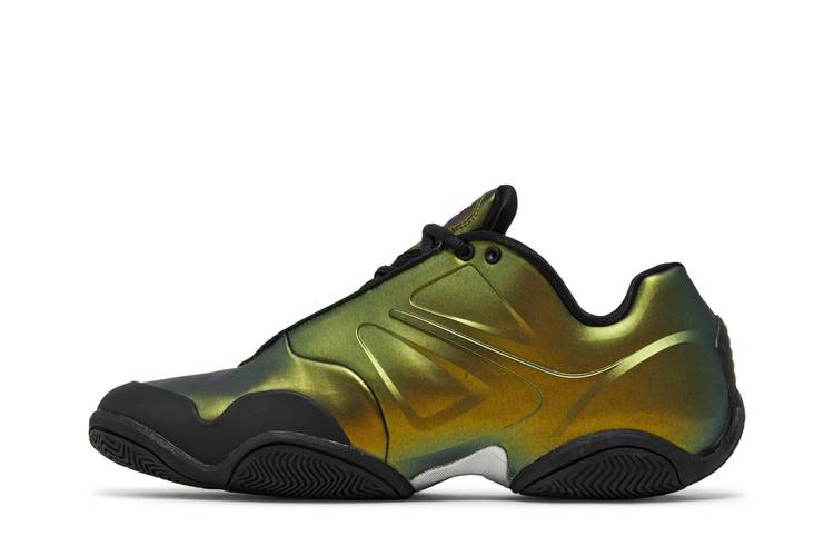 Модель Supreme x Nike Air Zoom Courtposite "Metallic Gold" взята из пакета из трех предметов обуви, созданного эксклюзивно для нью-йоркского скейт-бренда. Переливающийся золотистый металлик нанесен на литой верх Posite, подчеркнутый надписью Supreme на боковом веке и накладкой на носок из прочной черной резины. Контрастные малиновые акценты расставлены на носочной части с двумя марками и сварном логотипе Supreme, украшающем язычок. Под подошвой из черной резины виднеется посеребренный хвостовик из TPU, обеспечивающий устойчивость в средней части стопы.- Артикул: FB8934-700