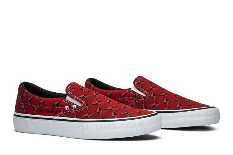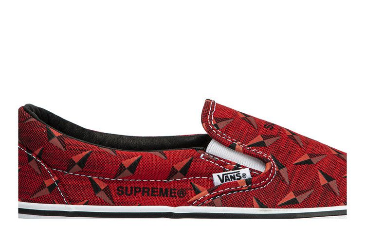 Vans объединился с многократным коллаборатором Supreme, чтобы выпустить пакет из шести кроссовок в мае 2019 года. Supreme x Classic Slip-On Pro 'Diamond Plate Red' - это классические кеды 1977 года, выполненные из красного канваса с узором, вдохновленным промышленным стальным покрытием, призванным предотвратить скольжение в часто проходимых местах. Кроссовки с низким верхом оснащены мягким носком, традиционной вулканизированной подошвой и резиновым протектором в стиле вафель.