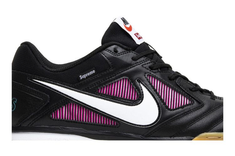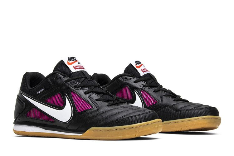 Nike SB возвращает культовую футбольную обувь Nike для закрытых помещений для сотрудничества с Supreme. Модель Gato выполнена в основном из черной кожи с контрастными красными акцентами на подкладке, а на пятке вышит значок Supreme "World Famous". Кроме того, подошва выполнена из жевательной резины, что напоминает о футбольной обуви для закрытых помещений.