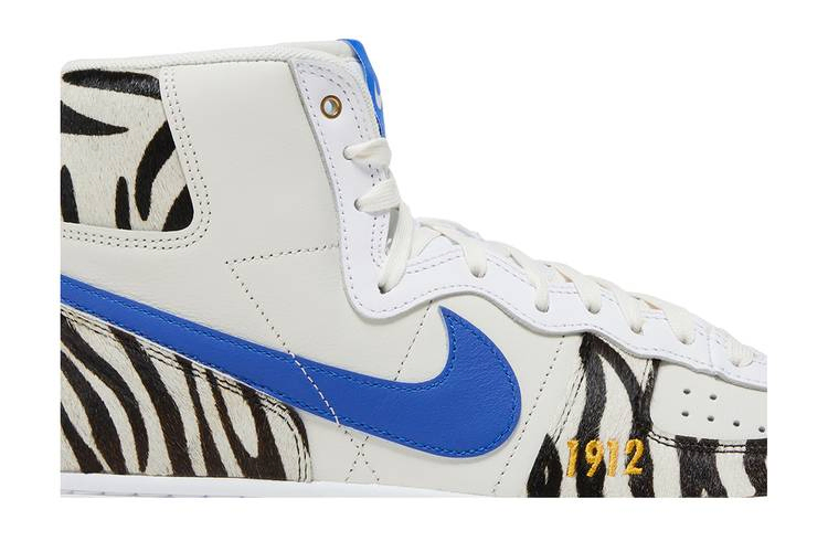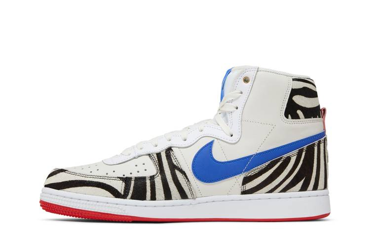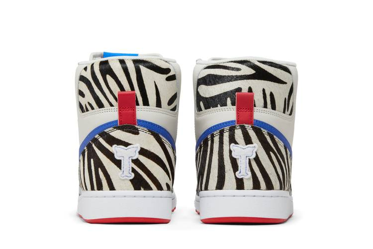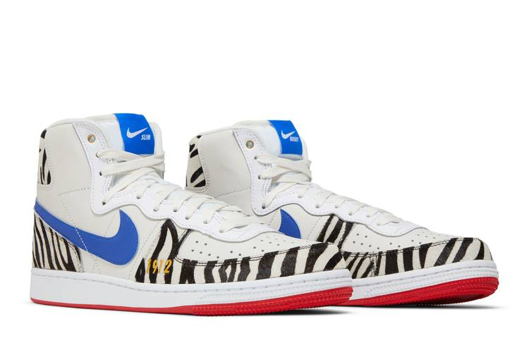 Модель Tennessee State University x Nike Terminator High "Slim & Husky's Pizza" посвящена известной закусочной на кампусе университета HBCU. Верх из кожи цвета слоновой кости украшен синим логотипом Swoosh и накладками из искусственной шерсти пони, которые отдают дань уважения команде Tigers. Надпись Slim & Husky's Pizza изображена на внутренней стороне язычка и носках, а на боковой части передней части стопы вышита надпись "1912" - кивок в сторону года основания TSU. Последний всплеск цвета придает резиновая подошва красного цвета.- Артикул: FV2047-001