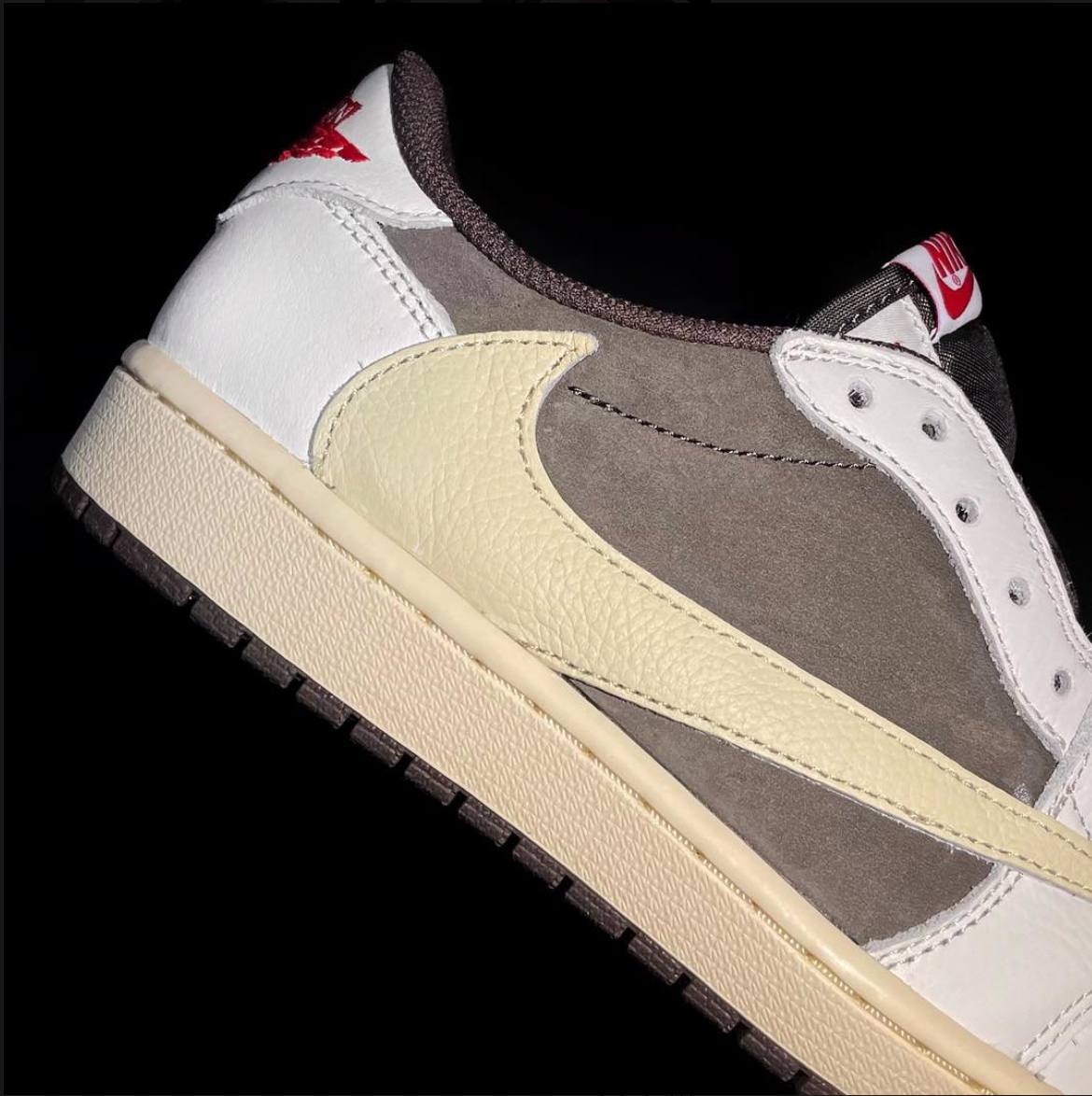 Силуэт Travis Scott x Air Jordan 1 Low OG "Reverse Mocha" представляет собой ремикс оригинальной модели AJ1 Low "Mocha" 2019 года. Верх сочетает коричневую замшу с кожаными накладками цвета слоновой кости и фирменным реверсивным Swoosh хьюстонского рэпера на боковой стороне, отличающимся большими размерами и нейтральным кремовым цветом. Контрастные алые акценты выделяют пару тканых язычков Nike Air, а также несочетаемые логотипы Cactus Jack и ретро Wings, вышитые на каждом пяточном язычке. Винтажная мидсоль из белой резины дополнена амортизацией Nike Air в пятке и подошвой из коричневой резины.- Цвета: Sail/University Red/Ridgerock