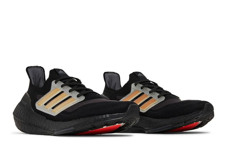 Модель adidas UltraBoost 21 "Black Iridescent" сочетает в себе отзывчивый ход и экологичную конструкцию. Верх из черного материала Primeknit, частично изготовленный с использованием Parley Ocean Plastic, дополнен полупрозрачным TPU на внешней стойке пятки и средней части стопы, последняя акцентирована трехполосным брендингом в переливающейся бронзовой отделке. Кроссовки опираются на полноразмерную промежуточную подошву Boost, которая содержит на 6 % больше капсул Boost, чем предшественник. Подошва Continental Rubber обеспечивает надежное сцепление с поверхностью.