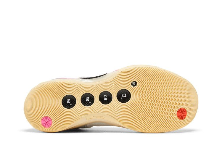 Кроссовки Way of Wade 10 "Blossom" украшены яркими цветами, вдохновленными цветущей вишней. Обтекаемый верх из белого трикотажного текстиля украшен переливающейся графикой молнии на медиальной боковой панели. Стабилизирующая обмотка из TPU в форме ключа с градиентным сочетанием розового и оранжевого цветов поддерживает полноразмерную промежуточную подошву Boom. Дополнительные преимущества включают в себя пластину из углеродного волокна на всю ладонь и устойчивую к скольжению резиновую подошву.