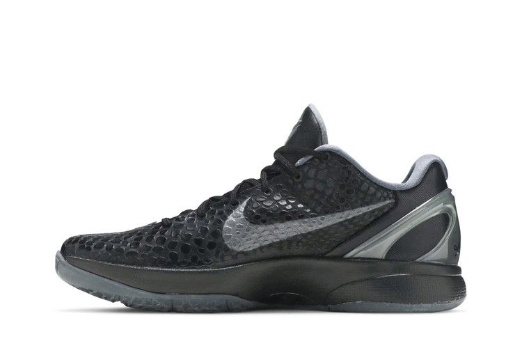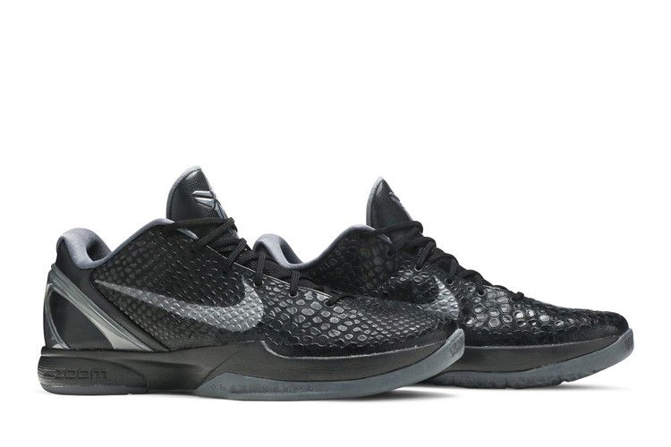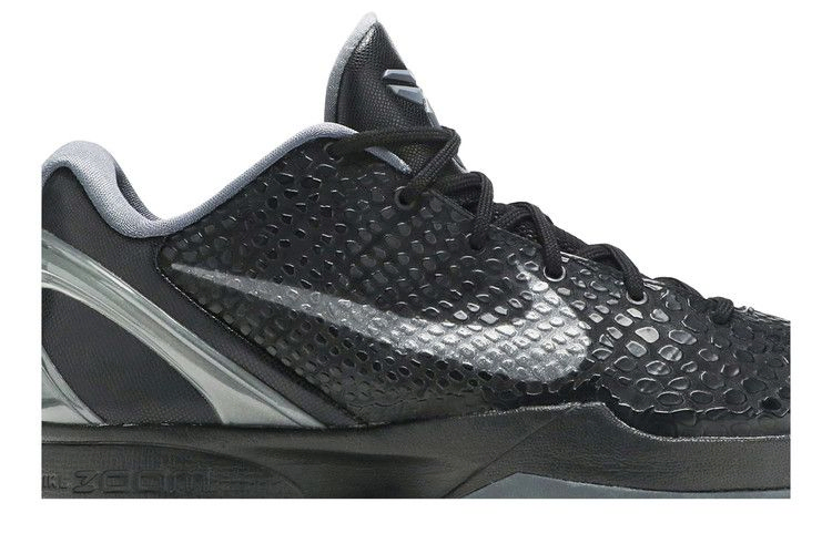 Nike Zoom Kobe 6 "Blackout" отличаются приглушенными черными и серыми тонами во внешнем оформлении легкой обуви. Цельный верх полностью покрыт полиуретановыми "островками" для повышения прочности, а чешуйчатая текстура навевает ассоциации с личностью Коби Брайанта Black Mamba. Дополнительными преимуществами модели являются поддерживающая технология Flywire, двухслойный носок из пеноматериала с эффектом памяти и промежуточная подошва с филоновыми вставками и блоками Zoom Air в пятке и носочной части.