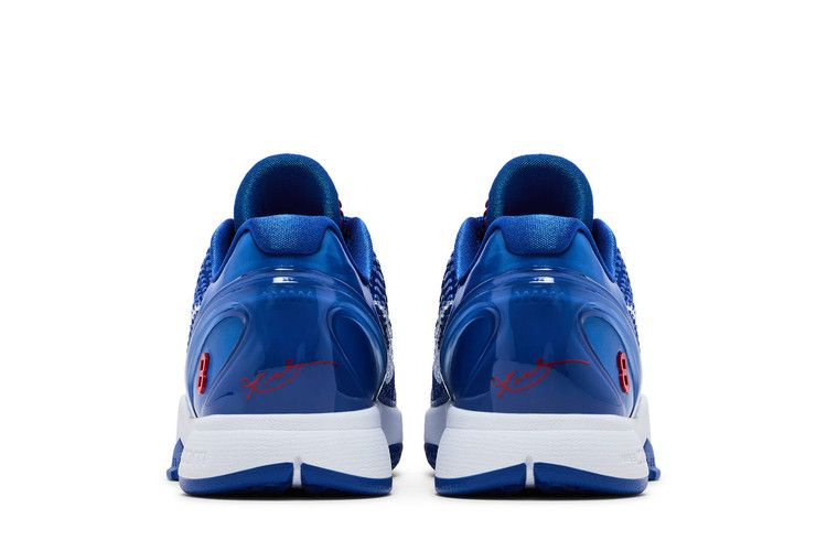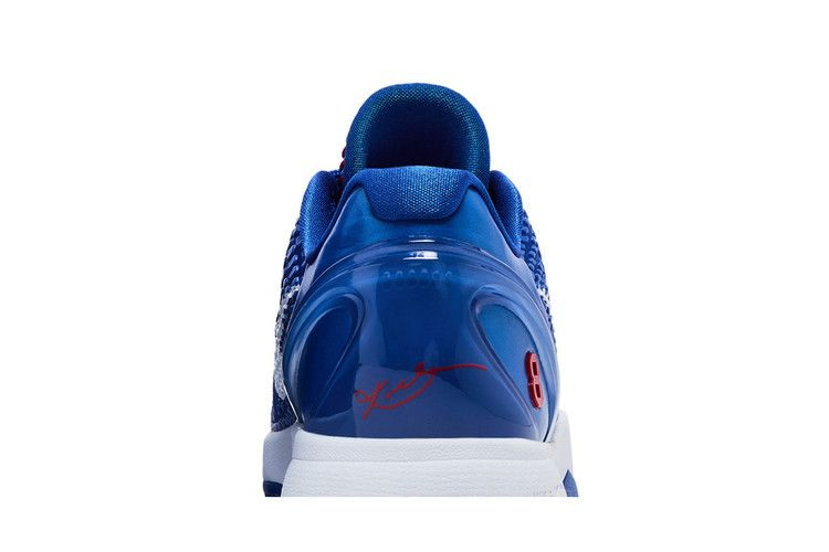 Модель Nike Zoom Kobe 6 Protro "Dodgers" посвящена франшизе Лос-Анджелеса MLB. Верхняя часть кроссовок выполнена в смелом королевском синем цвете и украшена полиуретановыми "островками", которые создают визуально поразительную текстуру змеиной кожи. Белая печать Swoosh украшает боковую панель, совпадает с пяткой и логотипом щита Коби Брайанта на язычке. Последний украшен красной бейсбольной строчкой, а на боковой пятке выбита малиновая цифра "8". Легкая межподошва Cushlon с амортизацией Zoom Air в передней части.