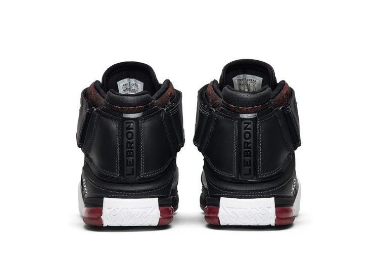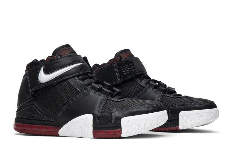 Nike LeBron 2 дебютировали в 2004 году в простой черно-красно-белой расцветке. Модель имеет верх из баллистической сетки с накладками из премиальной кожи и прочный ремешок на лодыжке, расположенный на двойном блоке Zoom Air. Фирменные детали включают контрастный Swoosh над ремешком и многослойные логотипы LJ23 и льва King James.