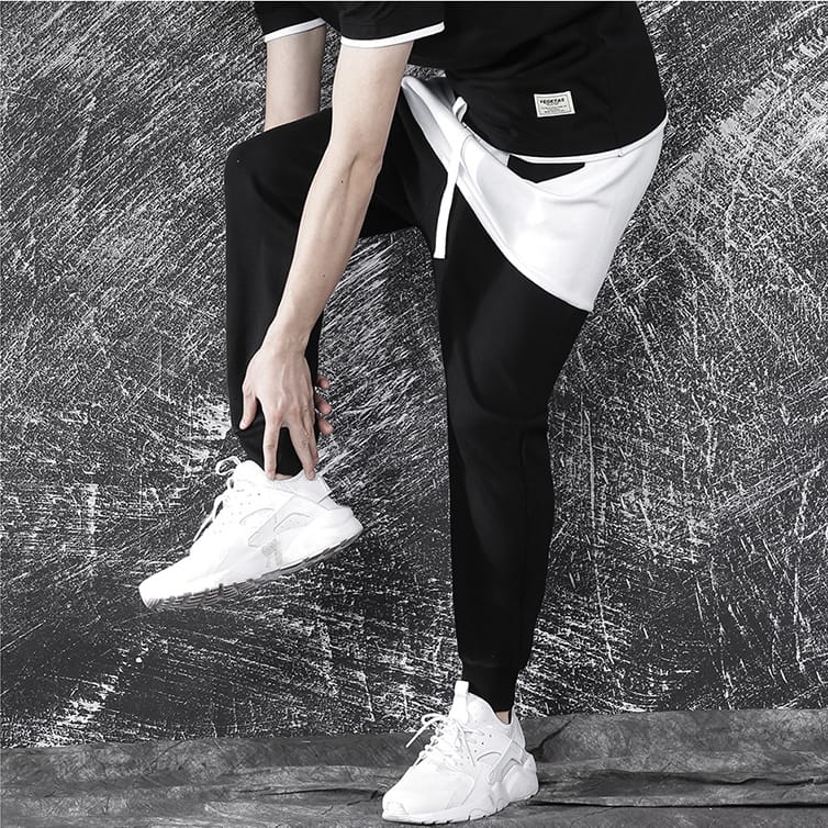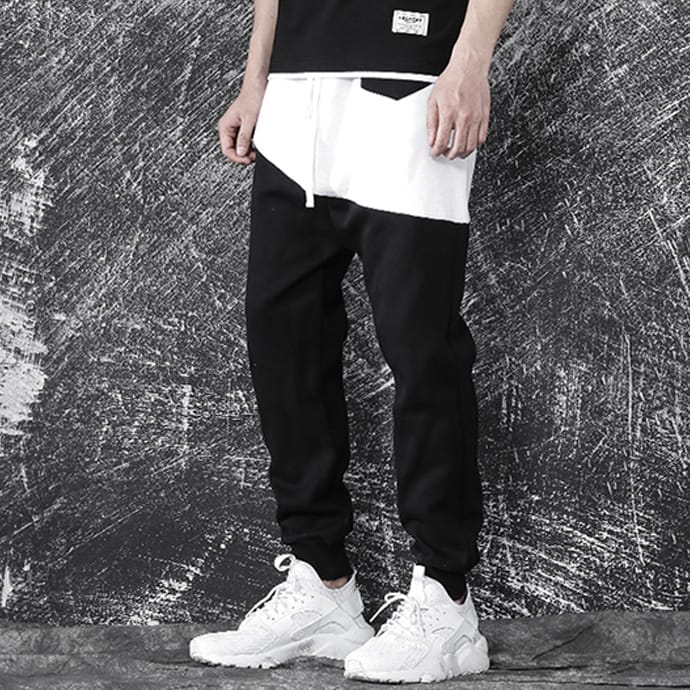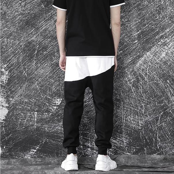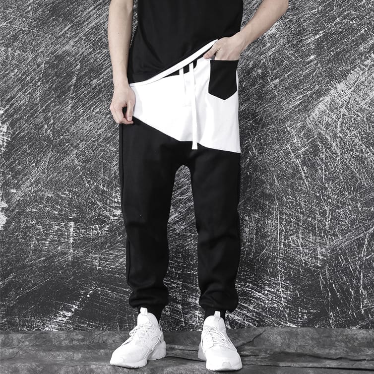 Спортивные штаны DPOY Colorblock White Pants из натурального хлопка имеют заниженный шаговый шов, что придает им оригинальный вид. Удобные черные брюки из трикотажа прекрасно сидят благодаря поясу на шнурке, а штанины снабжены эластичными манжетами. Контрастная белая вставка в верхней части и накладной карман дополняют дерзкий дизайн модели.