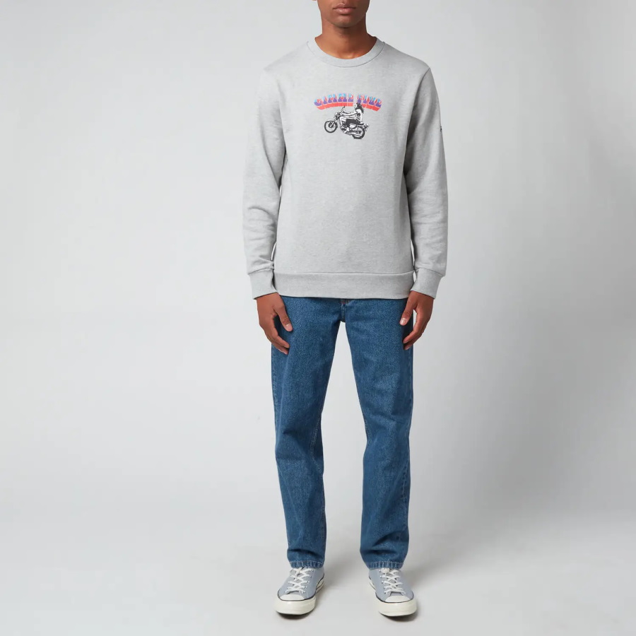 Свитшот A.P.C. Mika Sweatshirt Gray создан из высококачественного хлопкового трикотажа в сером цвете. APC и Gimme Five вместе разработали небольшую капсулу, которую они назвали Interactions. Свитшот из хлопкового трикотажа украшен цветной надписью в ретро стиле и принтом с изображением байкера. Круглый ребристый вырез, манжеты и подол для максимального комфорта. Успейте купить пока есть в наличии!