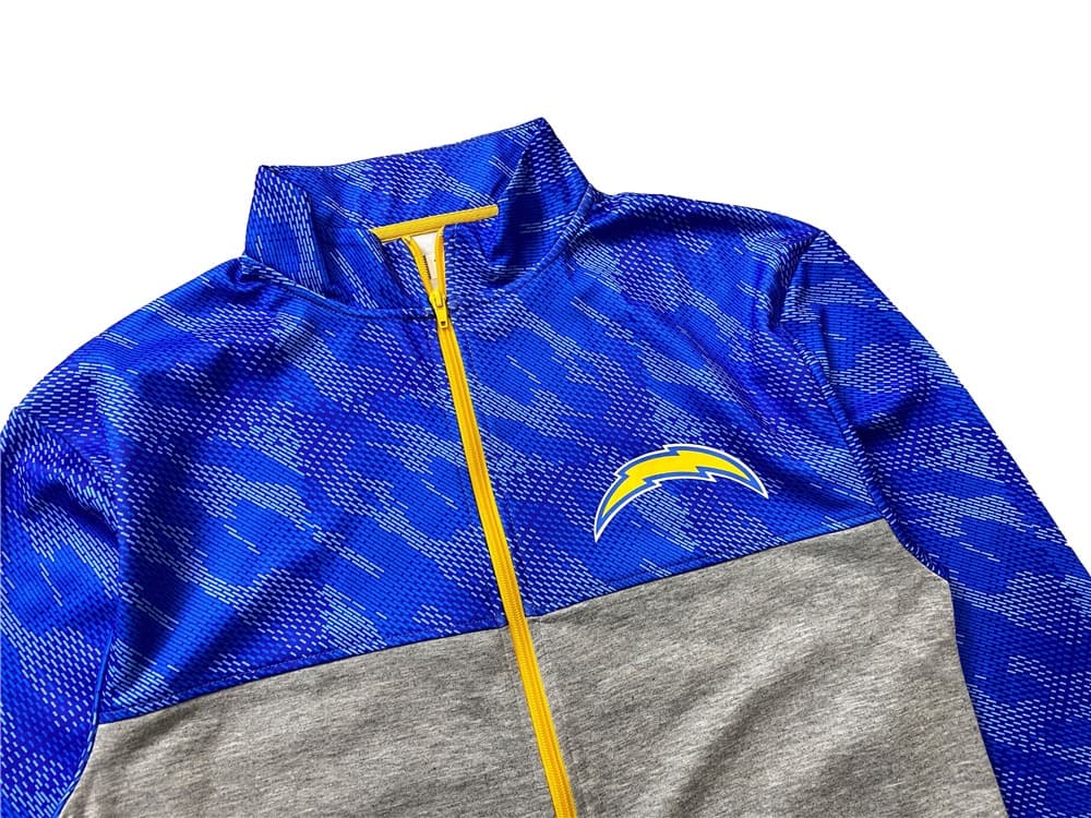 Куртка B20THER NFL Chargers Blue Jacket голубого цвета обладает свободным кроем с серой нижней частью и желтыми акцентами. На передней части располагается принт в цветах команды NFL Чарджерс. Комфортная куртка прекрасно подходит для тренировок, так как не ограничивает движений и изготовлена из быстросохнущего полиэстера.