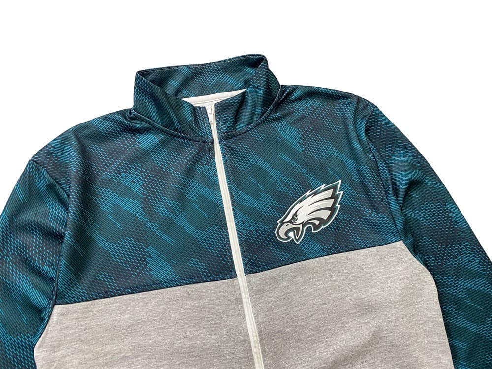 Куртка B20THER NFL Eagles Navy Jacket синего цвета обладает свободным кроем с серой нижней частью и белыми акцентами. На передней части располагается принт в цветах команды NFL Иглз. Комфортная куртка прекрасно подходит для тренировок, так как не ограничивает движений и изготовлена из быстросохнущего полиэстера.
