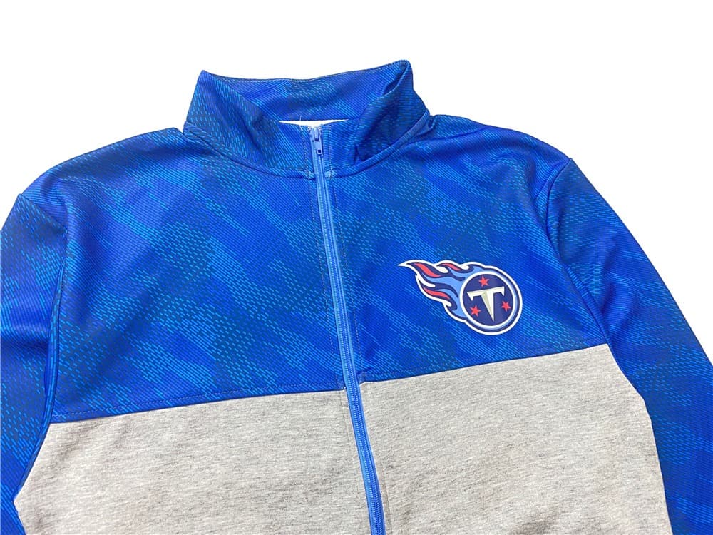 Куртка B20THER NFL Titans Blue Jacket голубого цвета обладает свободным кроем с серой нижней частью. На передней части располагается принт в цветах команды NFL Тайтенс. Комфортная куртка прекрасно подходит для тренировок, так как не ограничивает движений и изготовлена из быстросохнущего полиэстера.