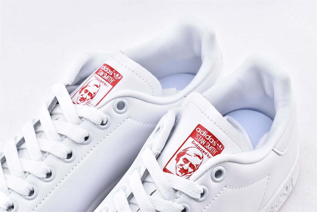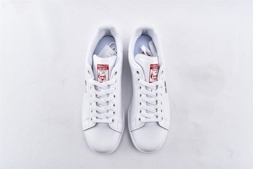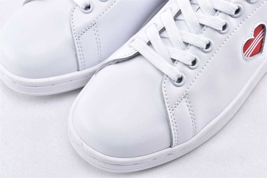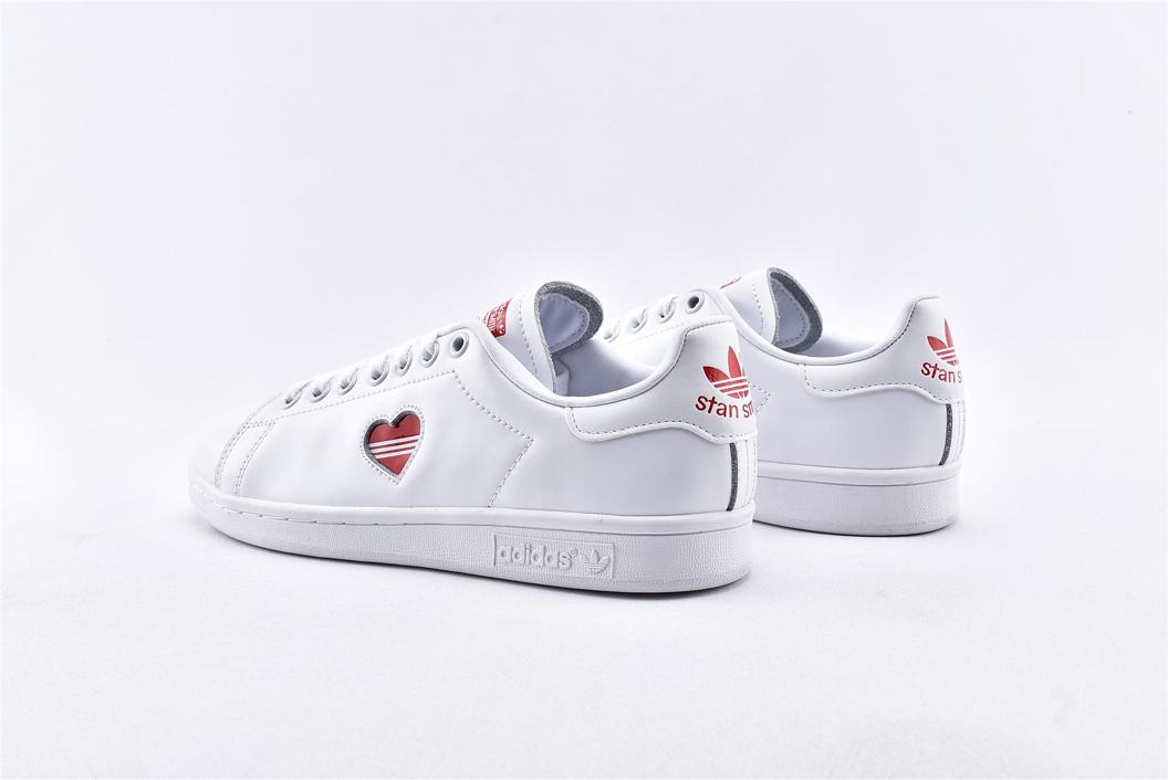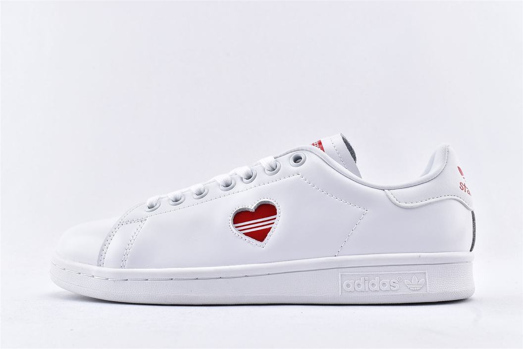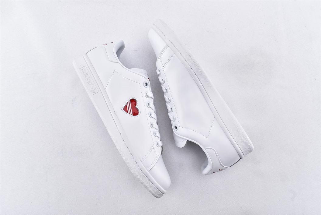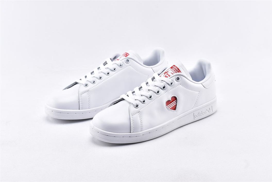 Классические кроссовки adidas Stan Smith Valentines Day 2019 W, неподвластные времени, в феврале 2019 года были созданы в честь Дня Святого Валентина специально для женщин. Верх модели выполнен из белой глянцевой лакированной кожи с красным вырезом в форме сердца на боковой стороне, вместо типичных перфорированных трехслойных полосок. Внизу кроссовки имеют твердую белую резиновую подошву для завершения дизайна.
