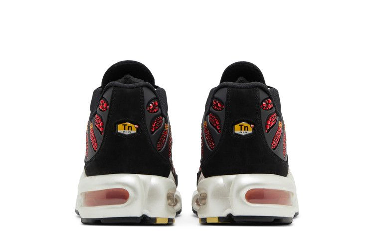Женские кроссовки Swarovski x Nike Air Max Plus "Sunset" украшены кристаллами Swarovski в виде мозаики, вдохновленной закатом, с градиентным сочетанием красных, оранжевых и желтых оттенков на верхней части. Контрастные черные акценты расставлены на волнистом каркасе из TPU и замшевом брызговике. Алый мини-Swoosh с черной вышивкой украшает четверть панели, а значок Tn Air украшает заднюю часть пятки. Амортизация выполнена в виде белой полиуретановой промежуточной подошвы, оснащенной голенищем из TPU и видимыми блоками подошвы Air в носочной и пяточной частях.