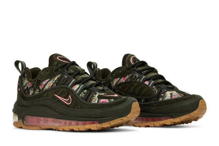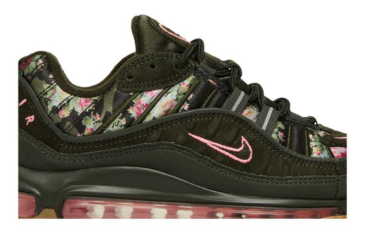 Кроссовки Nike Air Max 98 'Floral Camo', входящие в пакет из пяти кроссовок, выпущенный в июле 2018 года, сочетают в себе строгий дизайн и женственность. Эти женские кроссовки, выполненные в характерной для модели эстетике многоуровневой волны, имеют привлекательный верх с графическими цветочными панелями. Боковые стороны покрыты различными оттенками оливково-зеленой кожи нубук и смешанных материалов с контрастными розовыми фирменными элементами на пятке и промежуточной подошве. Ярко-розовый блок Max Air и подошва из жевательной резины завершают образ.