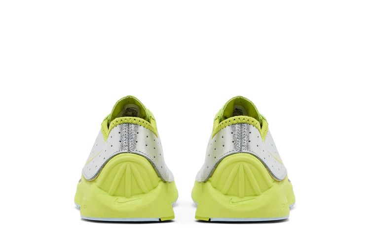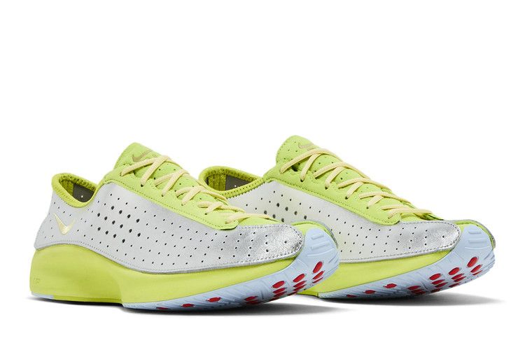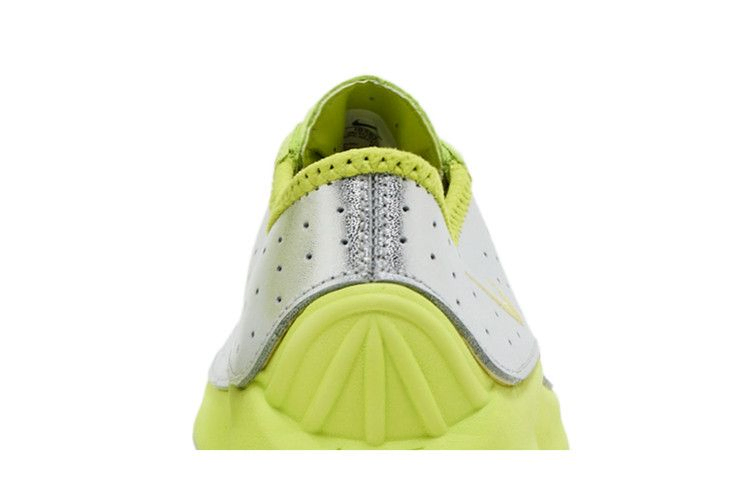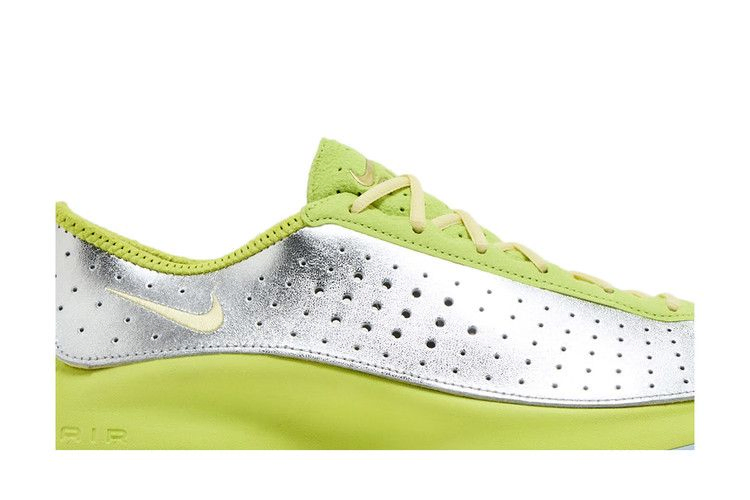 Женские кроссовки Nike Air Superfly 'Cyber' сочетают в себе неоново-зеленую замшу и искусственную кожу с перфорацией и серебристым металлическим покрытием. Минималистичная конструкция с обратным швом обеспечивает плавную посадку и избавляет от необходимости использовать традиционный носок. Промежуточная подошва из пеноматериала с амортизацией Air-sole поддерживается резиновой подошвой, усыпанной красными точками, которые повторяют расположение шипов оригинальных Superfly.