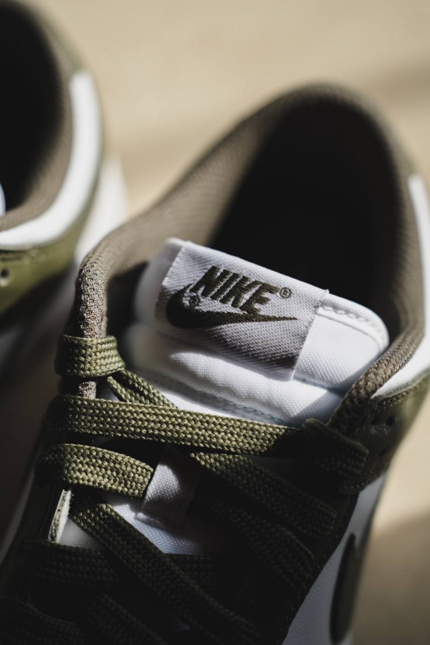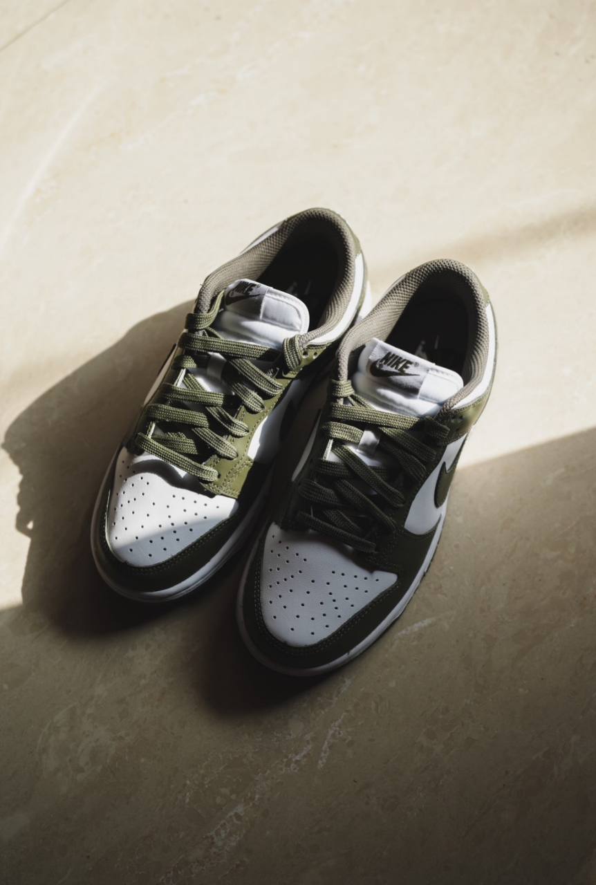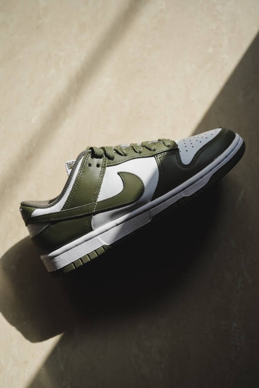 Женские кроссовки Nike Dunk Low "Medium Olive" выполнены в традиционной двухцветной расцветке, напоминающей о начальной серии моделей "Be True to Your School" 1985 года. Кожаный верх сочетает в себе чистую белую основу с оливково-зелеными накладками и подобранным по цвету Swoosh. В основе модели лежит традиционная резиновая подошва с белыми боковыми стенками, в которые вставлен клин из легкой пены, обеспечивающий мягкость хода. Под ногами подошва из оливковой резины с рисунком сцепления, разработанным для паркета.- Цвет: White/Medium Olive/White