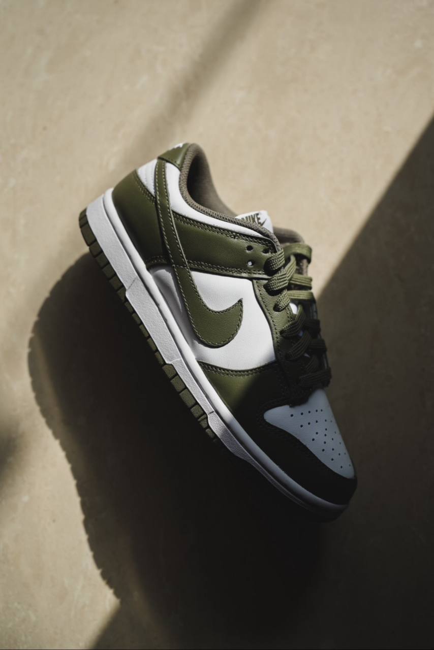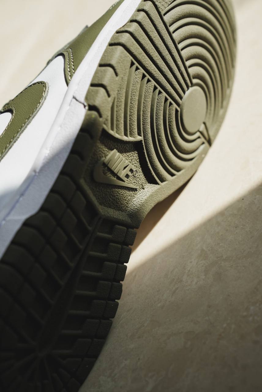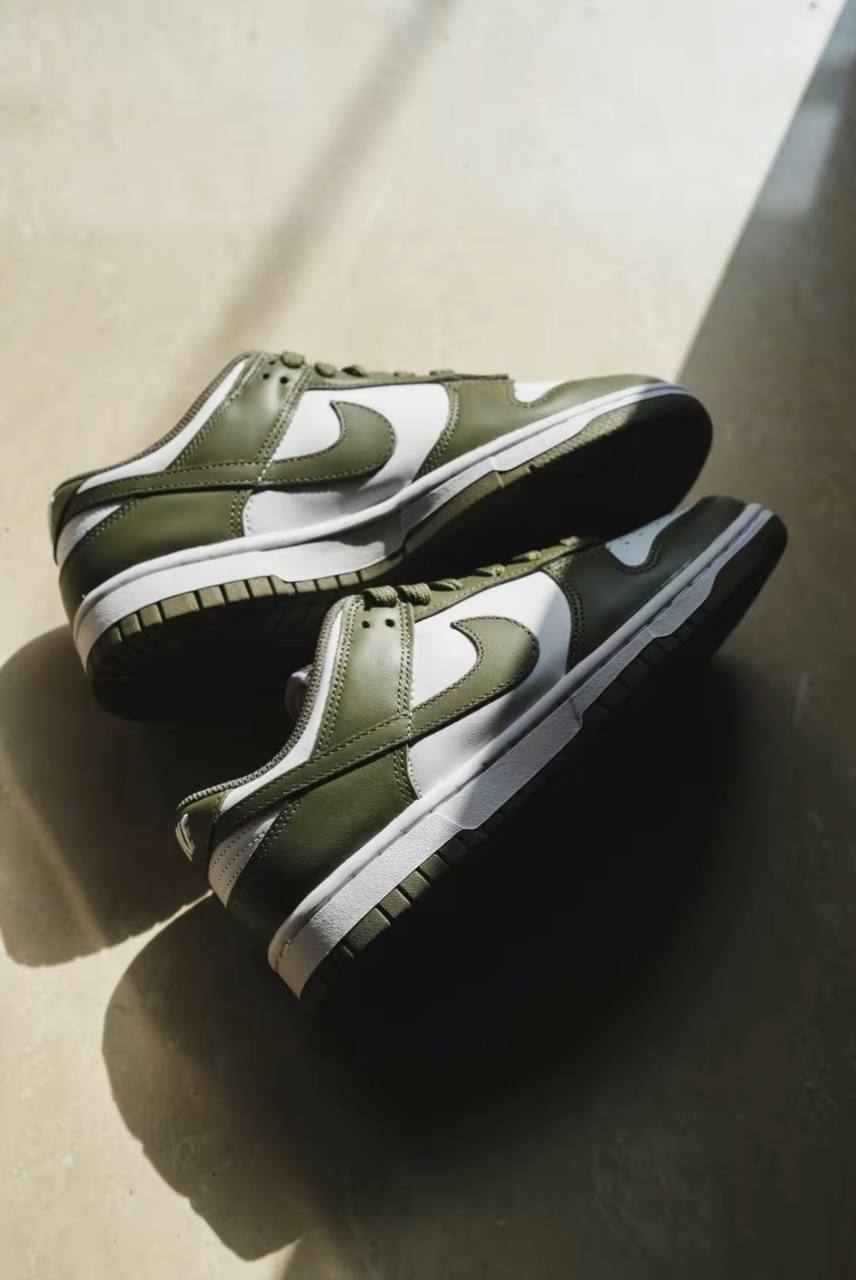 Женские кроссовки Nike Dunk Low "Medium Olive" выполнены в традиционной двухцветной расцветке, напоминающей о начальной серии моделей "Be True to Your School" 1985 года. Кожаный верх сочетает в себе чистую белую основу с оливково-зелеными накладками и подобранным по цвету Swoosh. В основе модели лежит традиционная резиновая подошва с белыми боковыми стенками, в которые вставлен клин из легкой пены, обеспечивающий мягкость хода. Под ногами подошва из оливковой резины с рисунком сцепления, разработанным для паркета.- Цвет: White/Medium Olive/White