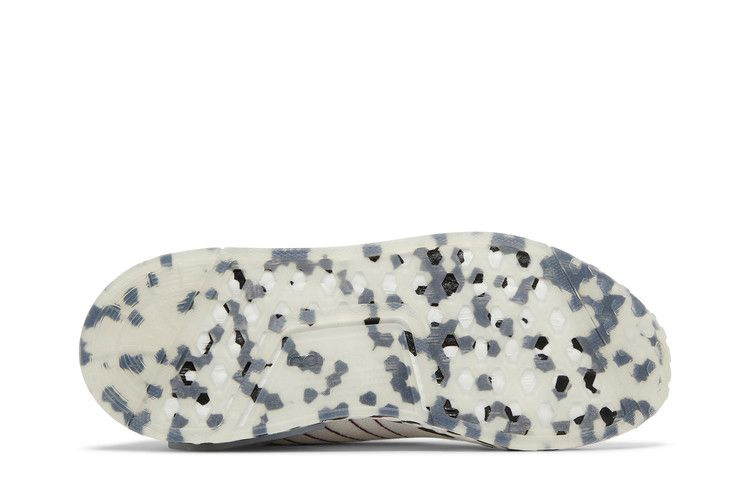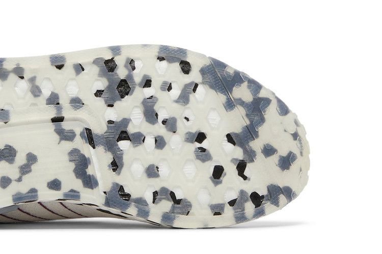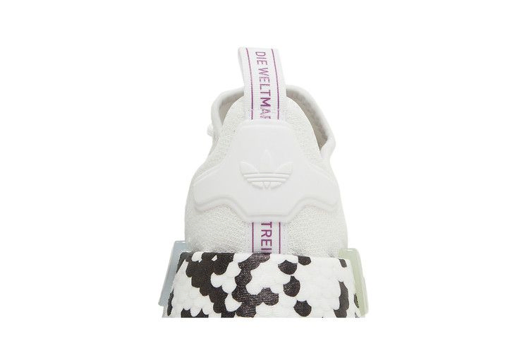 Женские adidas NMD_R1 "Color Splash" выделяют полноразмерную промежуточную подошву Boost с чешуйчатым принтом в неравномерной бело-черной гамме. Прозрачные заглушки EVA обеспечивают повышенную устойчивость, сохраняя при этом классическую эстетику NMD. Верхняя часть кроссовок выполнена из трикотажного текстиля, частично изготовленного из переработанного сырья, и имеет тонкую отделку Cloud White. Активные фиолетовые акценты присутствуют в элементах брендинга кроссовок, включая простроченные трехполосные полосы и язычок с трилистником.