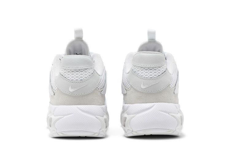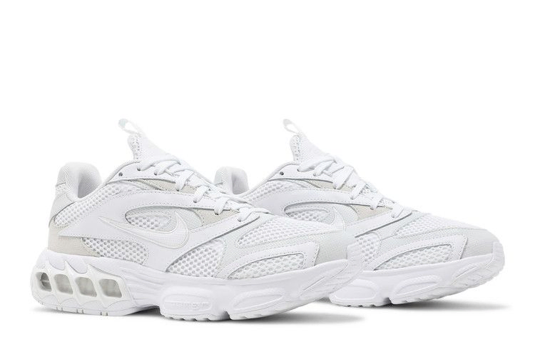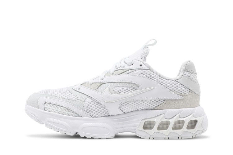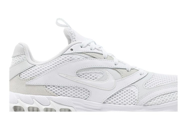 Женские кроссовки Nike Zoom Air Fire "Photon Dust" предлагают динамичные линии и многослойную конструкцию в монохроматическом исполнении. Верхняя часть выполнена из открытой белой сетки с дугообразными накладками из искусственной кожи и замши. Отличительная особенность кроссовок напоминает Air Zoom Spiridon Caged 2: скульптурная межподошва из пеноматериала с блоком Zoom Air под пяткой. Подошва оснащена резиновыми вставками для надежного сцепления с поверхностью.