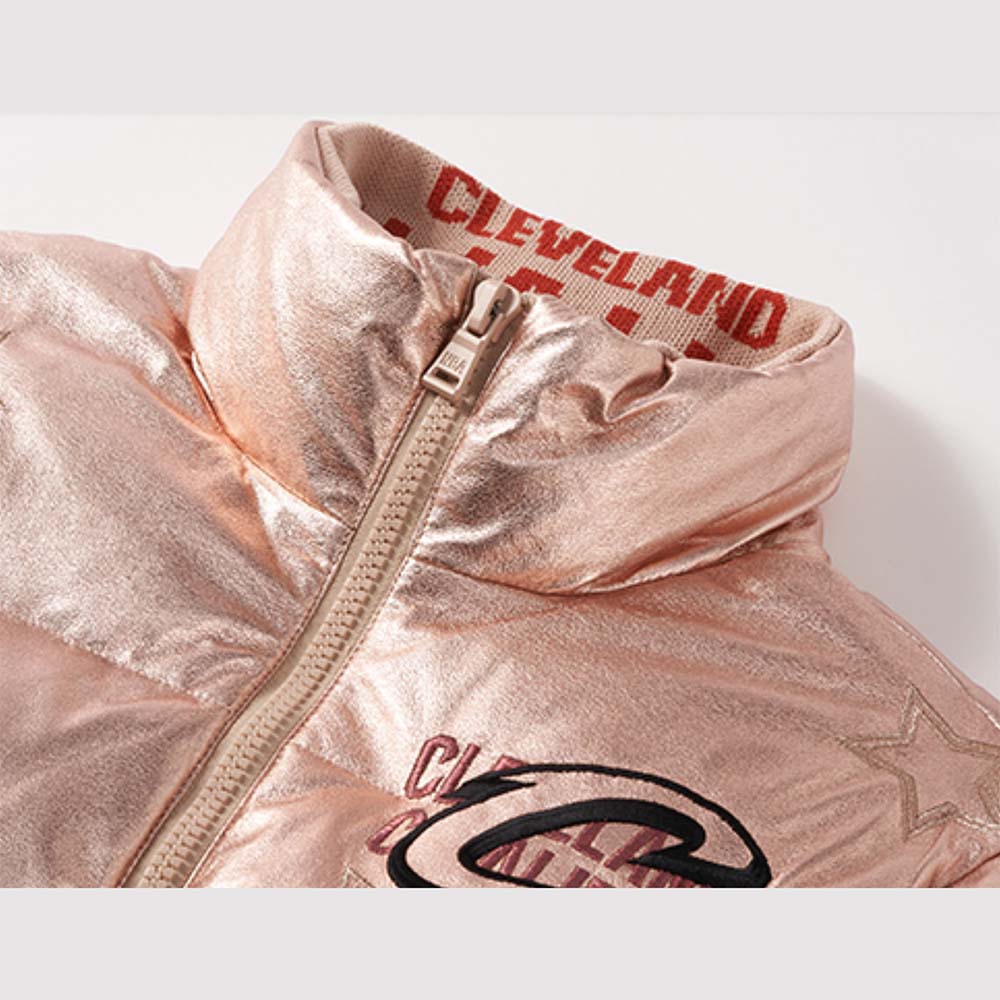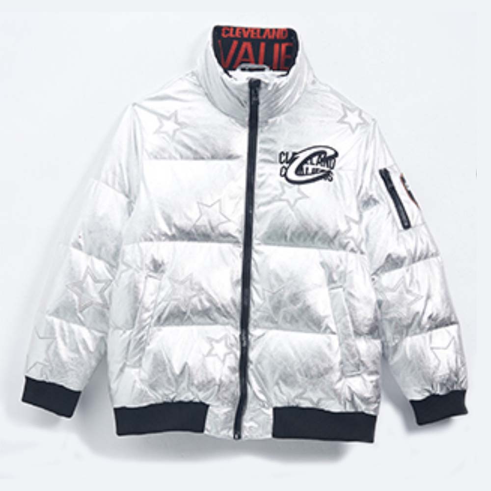 Пуховик 2020 Cleveland Cavaliers Down Jacket Womens выполнен в двух блестящих цветах: золотом и серебряном. В качестве наполнителя используется белый гусиный пух. Логотип и название команды Cleveland Cavaliers расположены на груди и спине. Узор из пятиконечных звезд украшает всю поверхность пуховика.- Цвет: золотой, серебряный