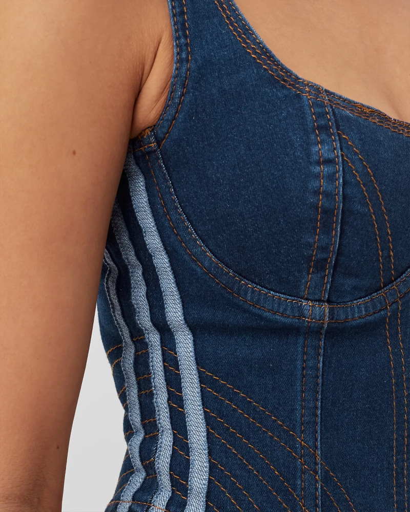 Боди adidas Ivy Park Denim Bodysuit Dark Denim изготовлено из прочного и эластичного джинсового материала темного цвета. Фирменные полосы adidas по бокам и вышитые логотипы брендов сзади украшают его. Изогнутые, продуманные швы и скрытые косточки подчеркивают вашу фигуру. Глубокий вырез и широкие бретели придают образу эффектности. Успейте купить, пока есть в наличии!