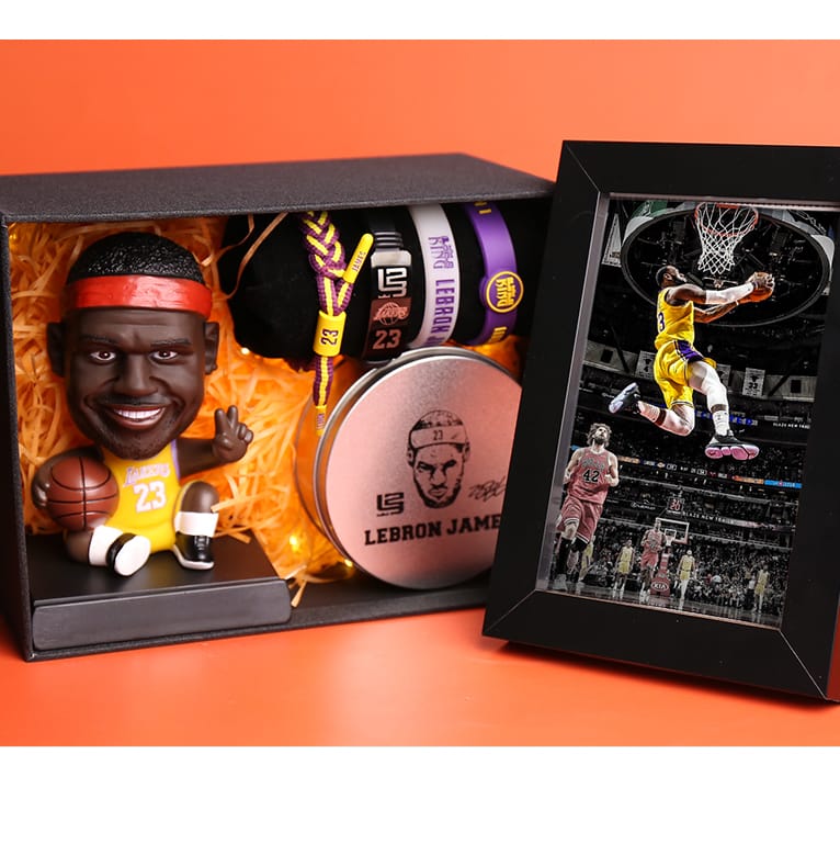 Подарочный набор Jinduo James Figurine Gift Set - это превосходный вариант подарка брату или другу. В него входит фигурка игрока Леброна Джеймса с мячом в форме команды Lakers, а так же 4 разных браслета с номером и символикой игрока. В коробке вы также найдете открытку с фото LeBron James, стильную жестяную емкость для хранения браслетов, а также наполнитель и LED-подсветку. С таким набором вы сможете красиво упаковать подарок и создать праздничную атмосферу.