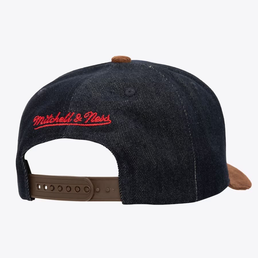 Темно-синяя бейсболка с красными акцентами Mitchell & Ness Denim Brown San Francisco 49ers Corduroy D-Stressed Pro Snapback Hat в ретро-стиле имеет застежку-защелку сзади для регулировки, вышитый логотип команды 49ers, бренда Mitchell & Ness сзади и загнутый козырек для максимального стиля. Бейсболка выполнена из уникального сочетания кордуры и денима.
