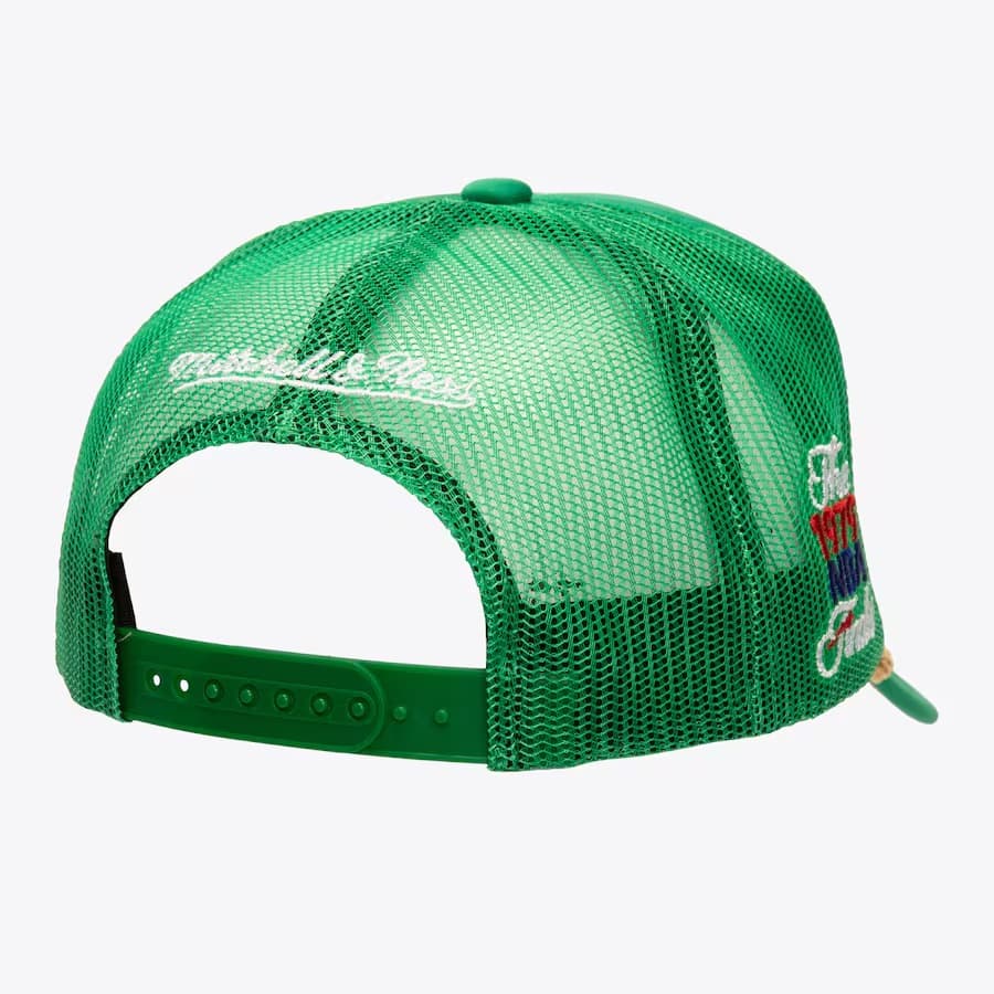 Зеленая бейсболка с сеткой Mitchell & Ness Green Seattle SuperSonics Hardwood Classics Golden Champs Trucker Hat в ретро-стиле имеет застежку-защелку сзади для регулировки, логотип чемпионов НБА 1979, вышитый логотип команды Сиэтл Суперсоникс, бренда Mitchell & Ness сзади и загнутый козырек для максимального стиля. Бейсболка выполнена из полиэстера с серой нижней частью козырька.- Цвет: Зеленый