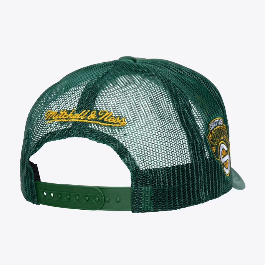 - Бейсболка Mitchell & Ness Green Seattle Supersonics Hardwood Classics Satin Trucker Snapback Hat