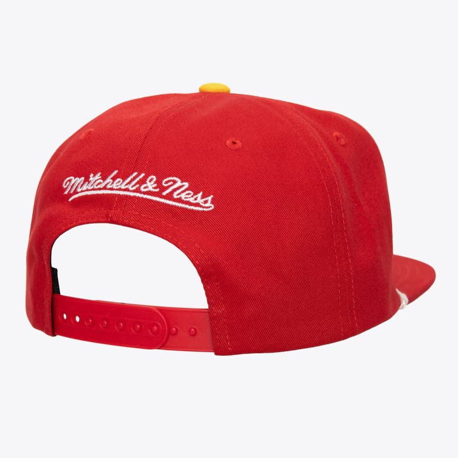 Красная бейсболка с желтыми акцентами Mitchell & Ness Red Atlanta Hawks Hardwood Classics Radiant Lines Deadstock Snapback Hat в ретро-стиле имеет застежку-защелку сзади для регулировки, вышитый логотип команды Хоукс, бренда Mitchell & Ness сзади и прямой козырек для максимального стиля. Бейсболка выполнена из 100% хлопка.- Цвет: Красный