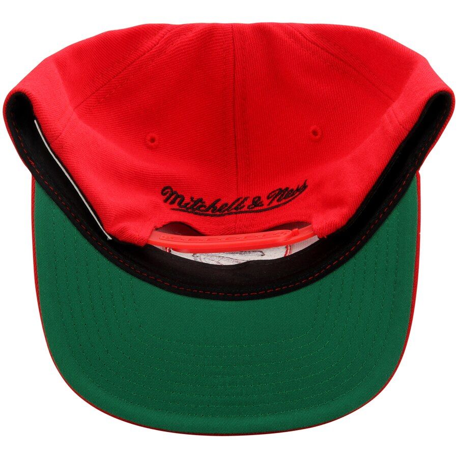 Снепбэк с символикой баскетбольной команды Toronto Raptors в красной расцветке. Прямой козырёк с внутренней стороны зелёной расцветки.-
