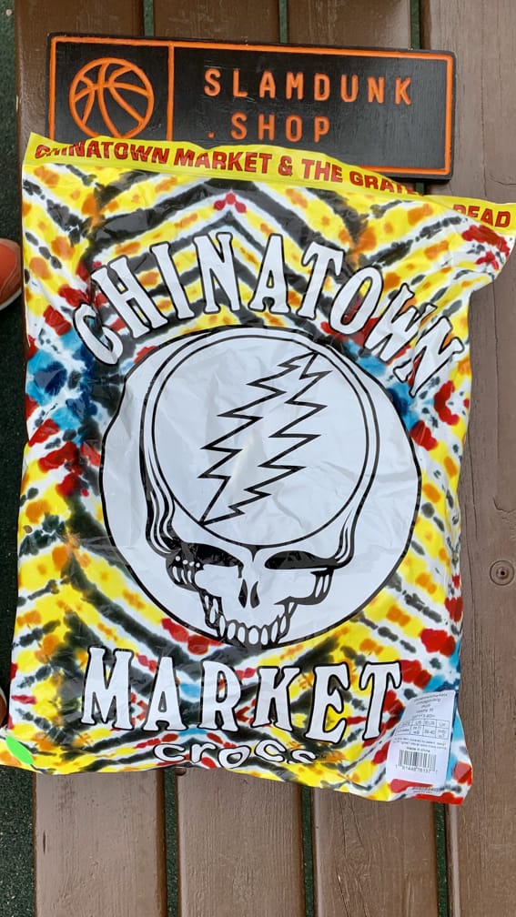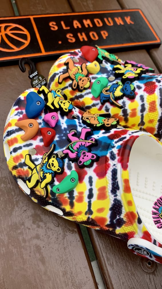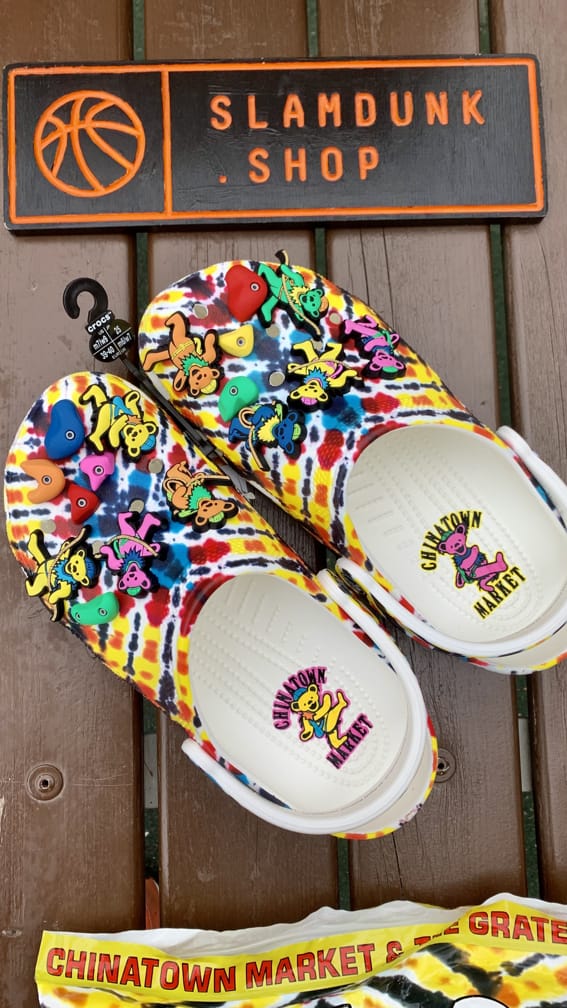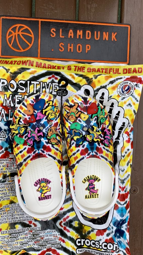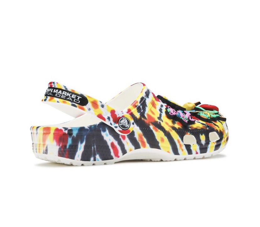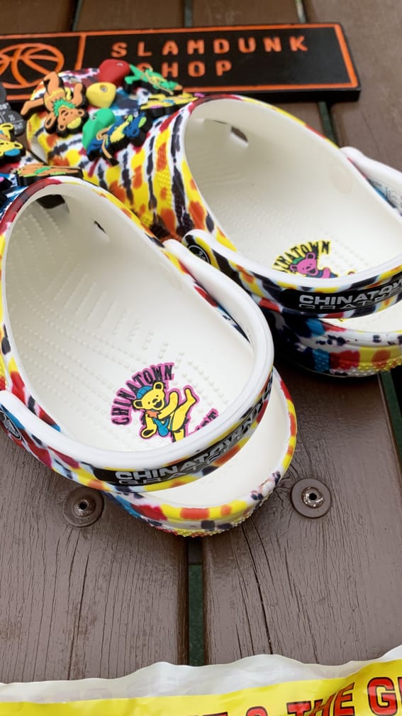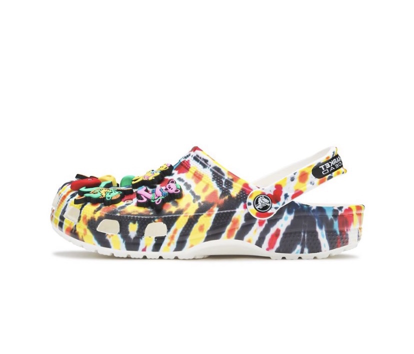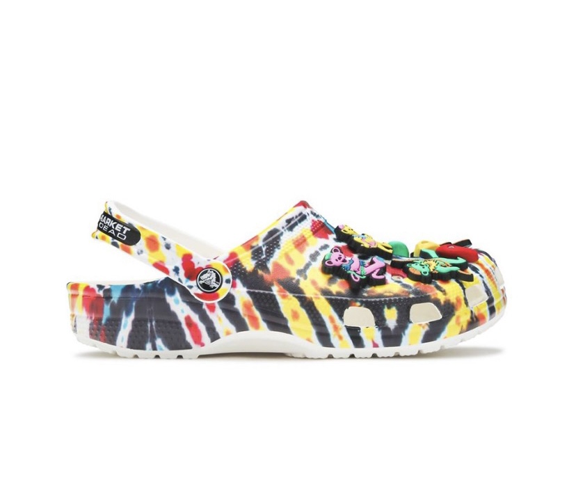 Сабо Grateful Dead x Chinatown Market x Crocs Clog Tie Dye является результатом масштабного сотрудничества легендарной группы из Сан-Франциско и бренда уличной одежды из Лос-Анджелеса. Обувь отличается принтом тай-дай со съемными 3D-подвесками Jibbitz, изображающими танцующих медведей. Логотипы Dual Chinatown Market и Grateful Dead украшают ремешок на пятке и стельку.- Цвета: Multi-Color